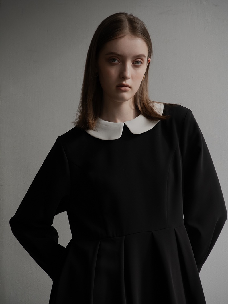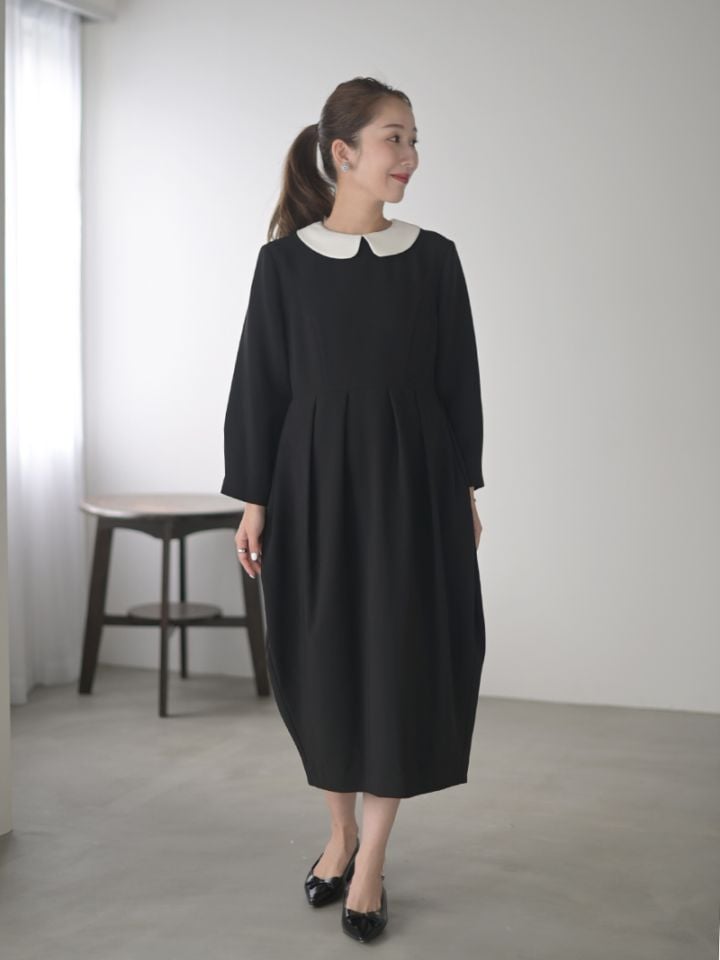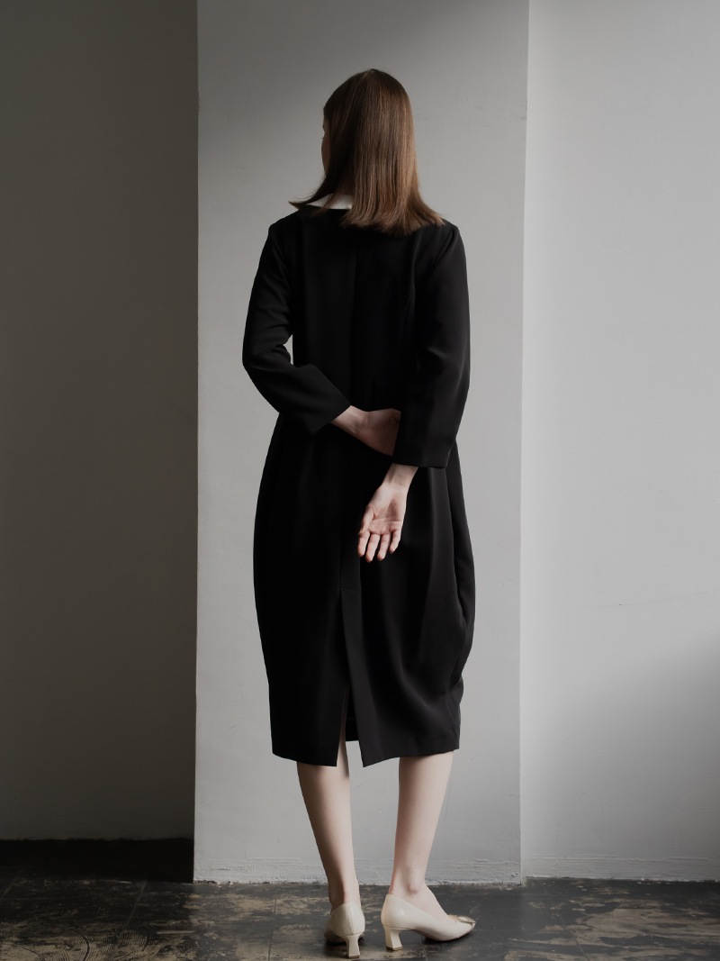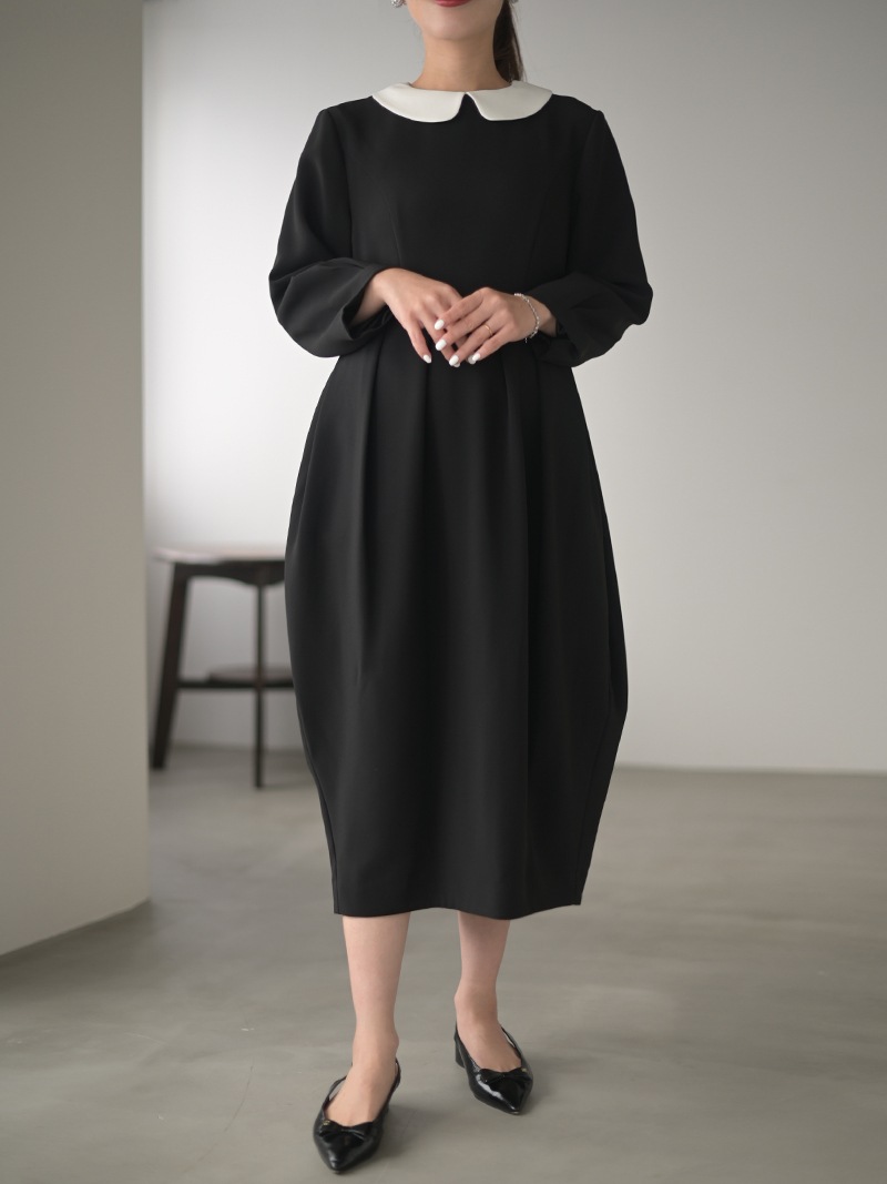 クラシカルなムード漂う襟取り外し可能なコクーンワンピース。全体的に切り替え部分でフォルムを出し、立体的なシルエットに作りこんだワンピース。