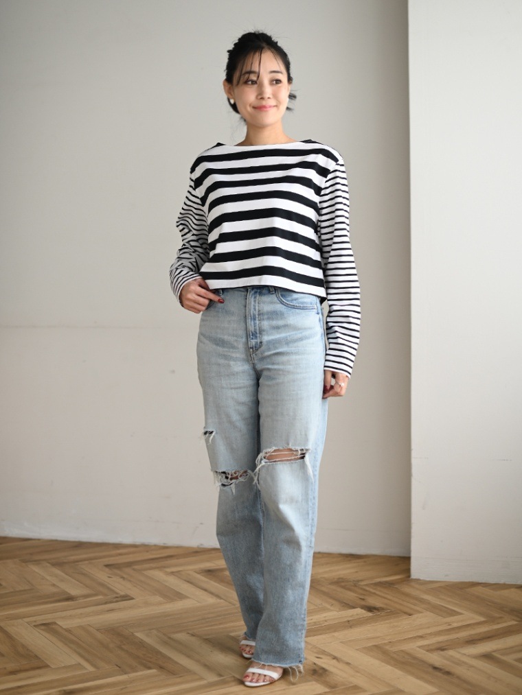 ピッチの異なるボーダーを掛け合わせたミックスボーダーT。ボーダーデザインを大人カジュアルな雰囲気で着用できるよう、袖を長めに着丈を短くクロップド丈に仕上げました。