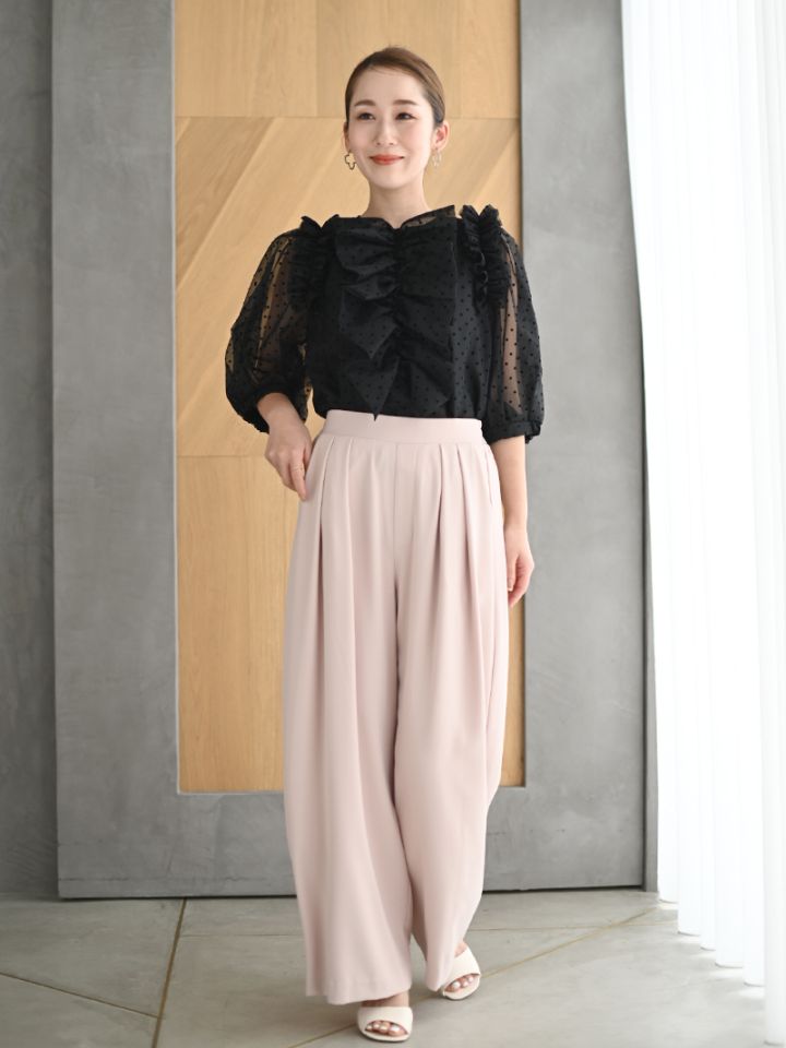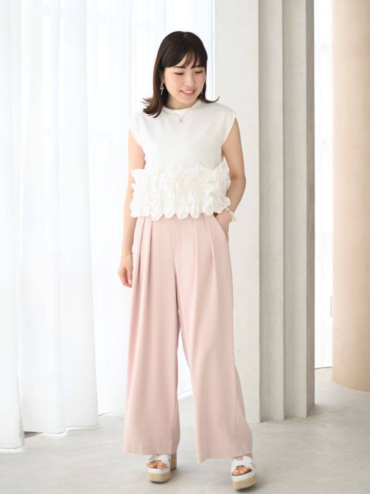 フロントに施したツータックがポイント。程よくワイドシルエットで脚のラインを拾わず、ウエストはバックゴム仕様でイージーな履き心地。