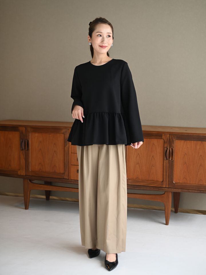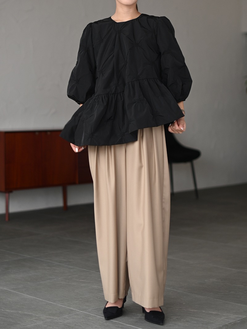 フロントに施したツータックがポイント。程よくワイドシルエットで脚のラインを拾わず、ウエストはバックゴム仕様でイージーな履き心地。
