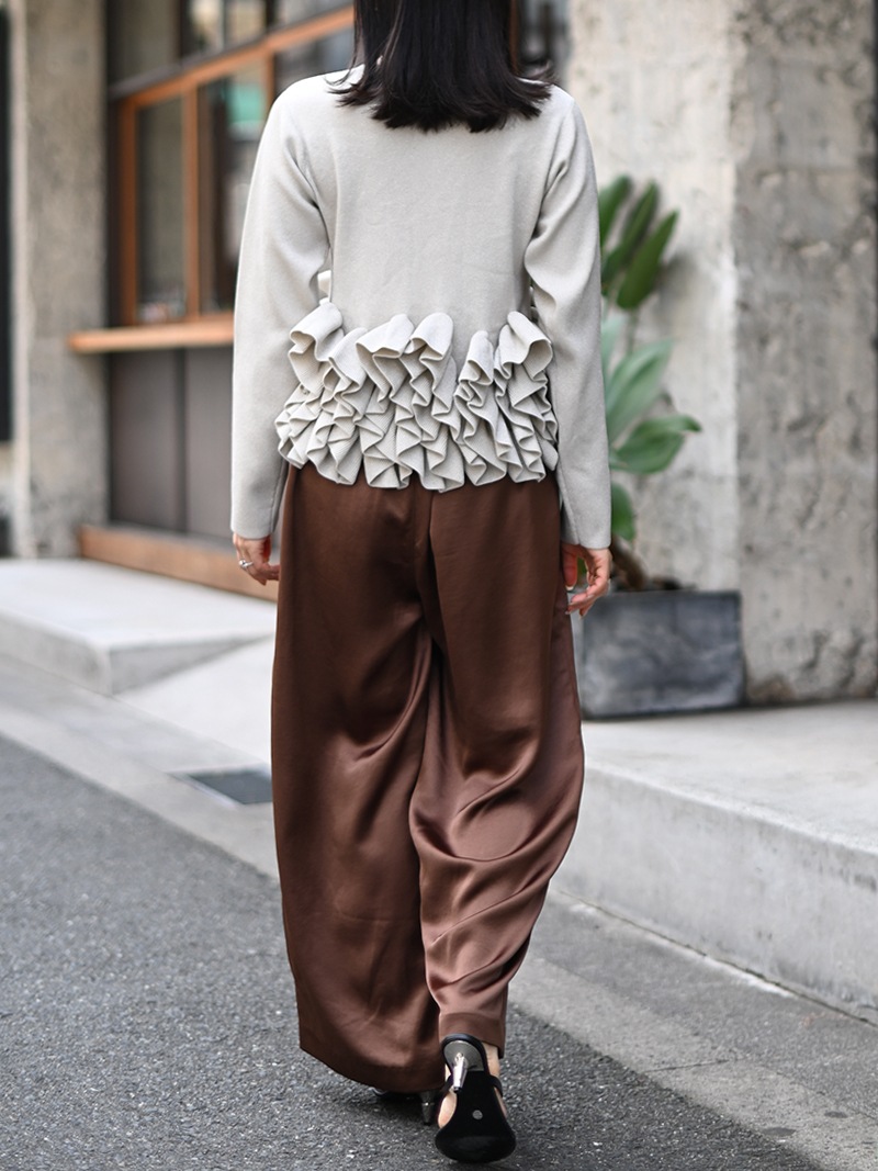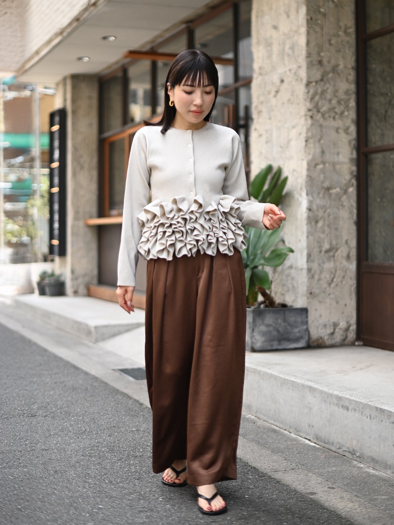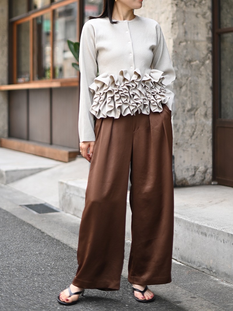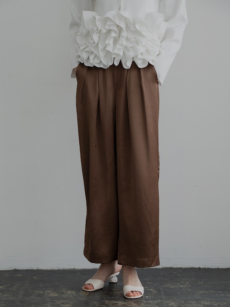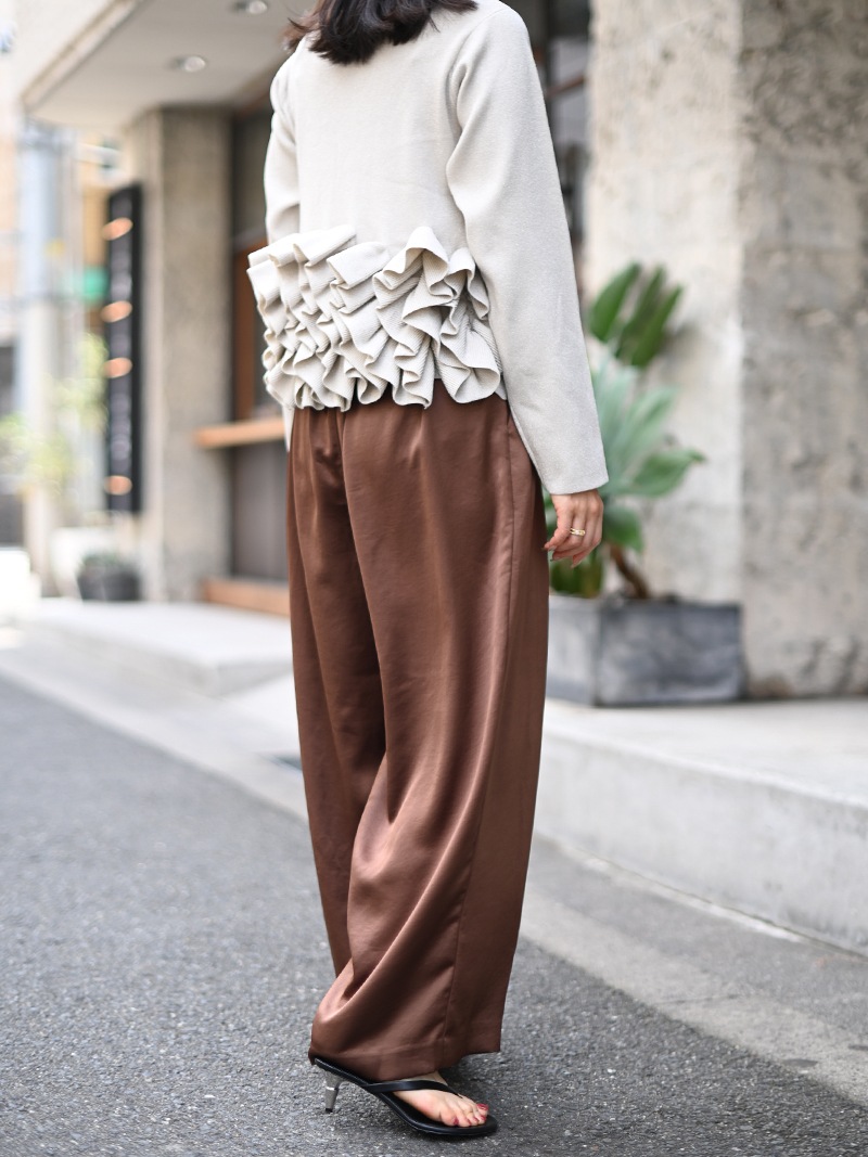 フロントに施したツータックがポイント。程よくワイドシルエットで脚のラインを拾わず、ウエストはバックゴム仕様でイージーな履き心地。