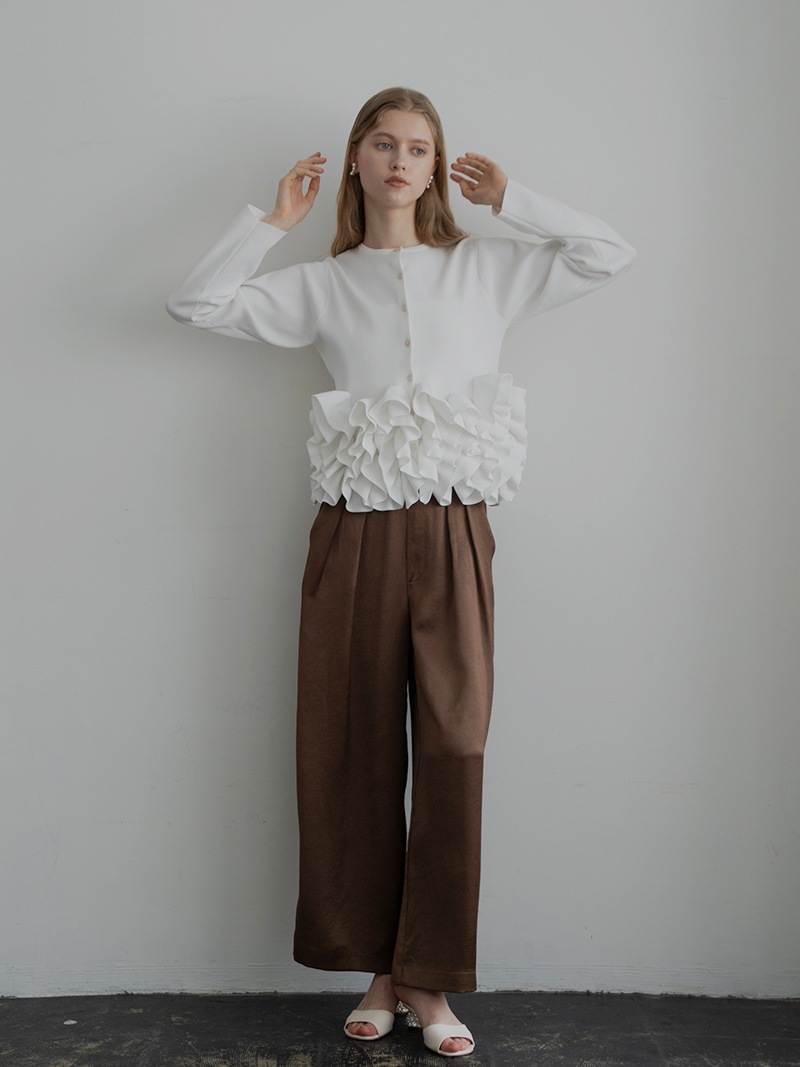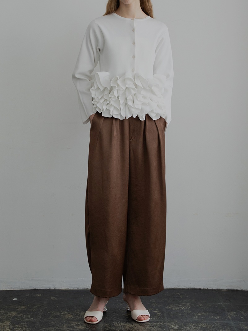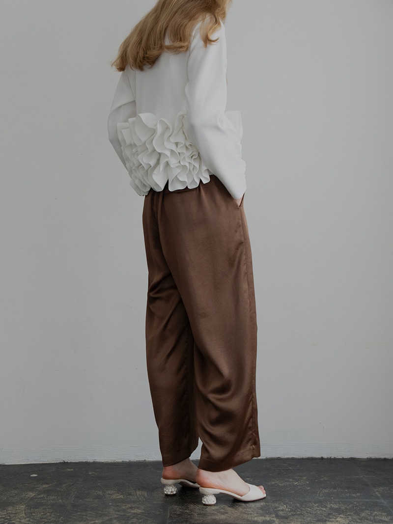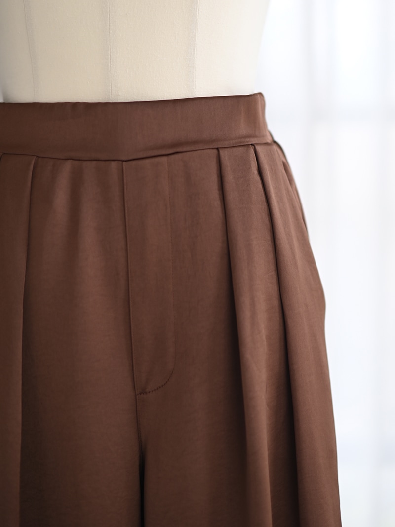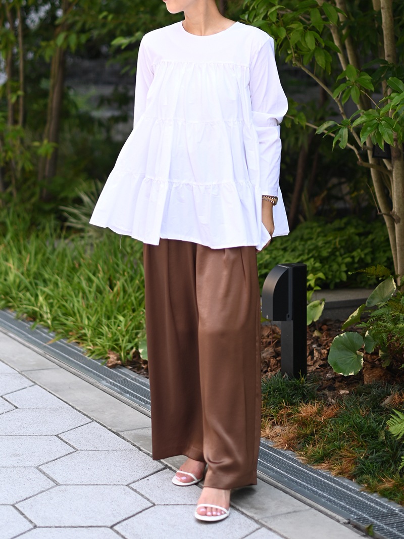 フロントに施したツータックがポイント。程よくワイドシルエットで脚のラインを拾わず、ウエストはバックゴム仕様でイージーな履き心地。