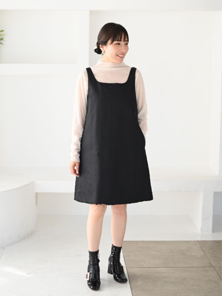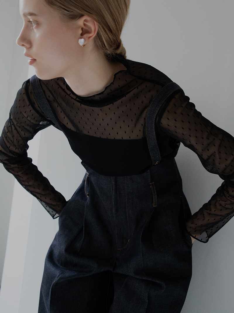レイヤードスタイルに活躍するシアートップス。ポリエステル100%のドットジャガード生地はシワになりにくく、イージーケアなのも嬉しいポイント。