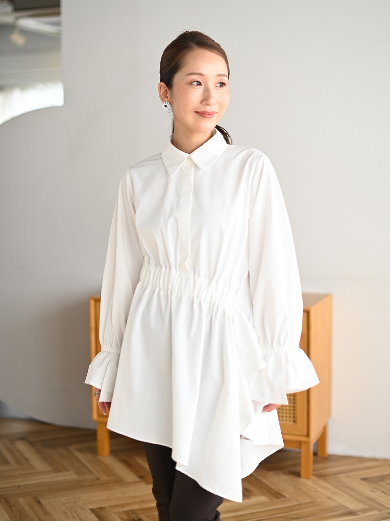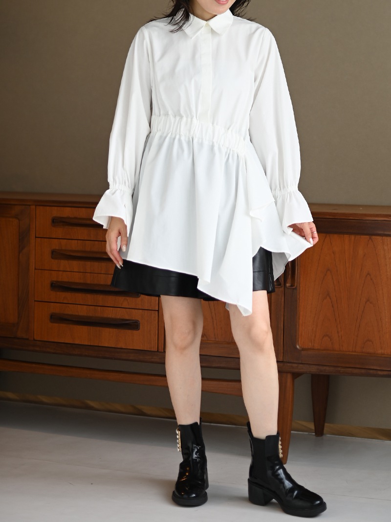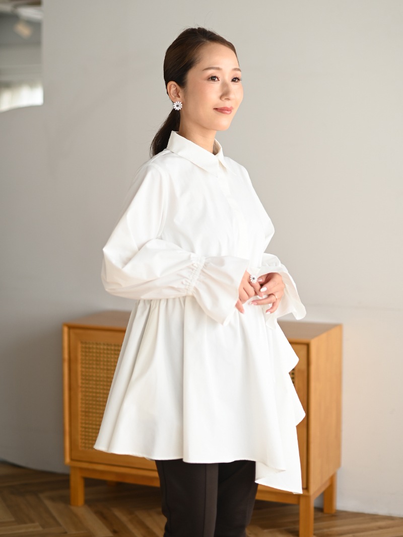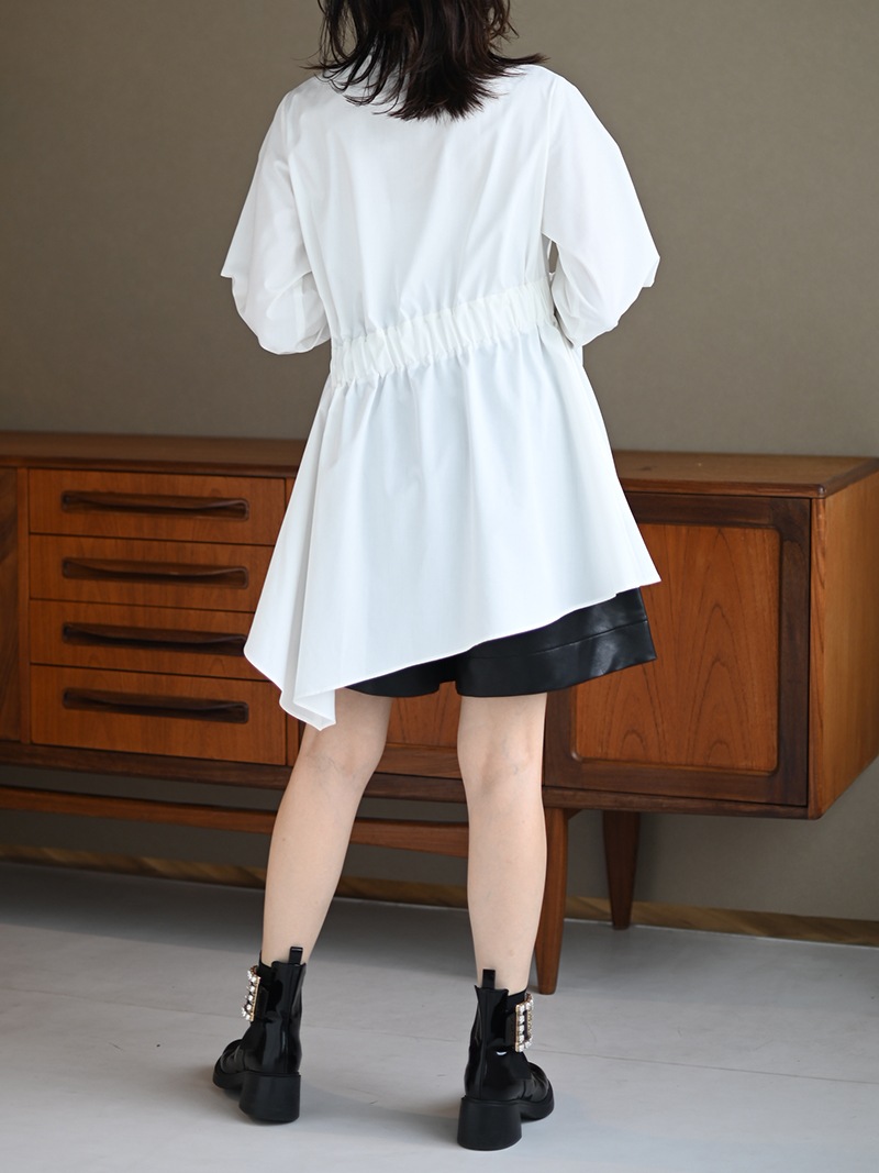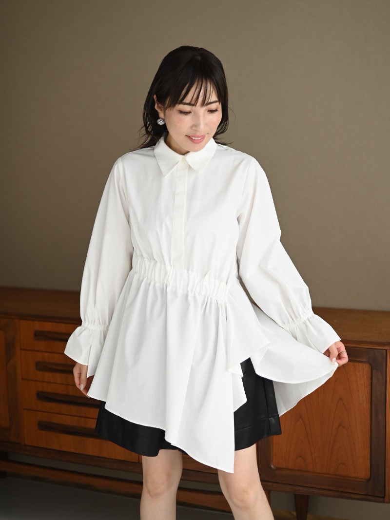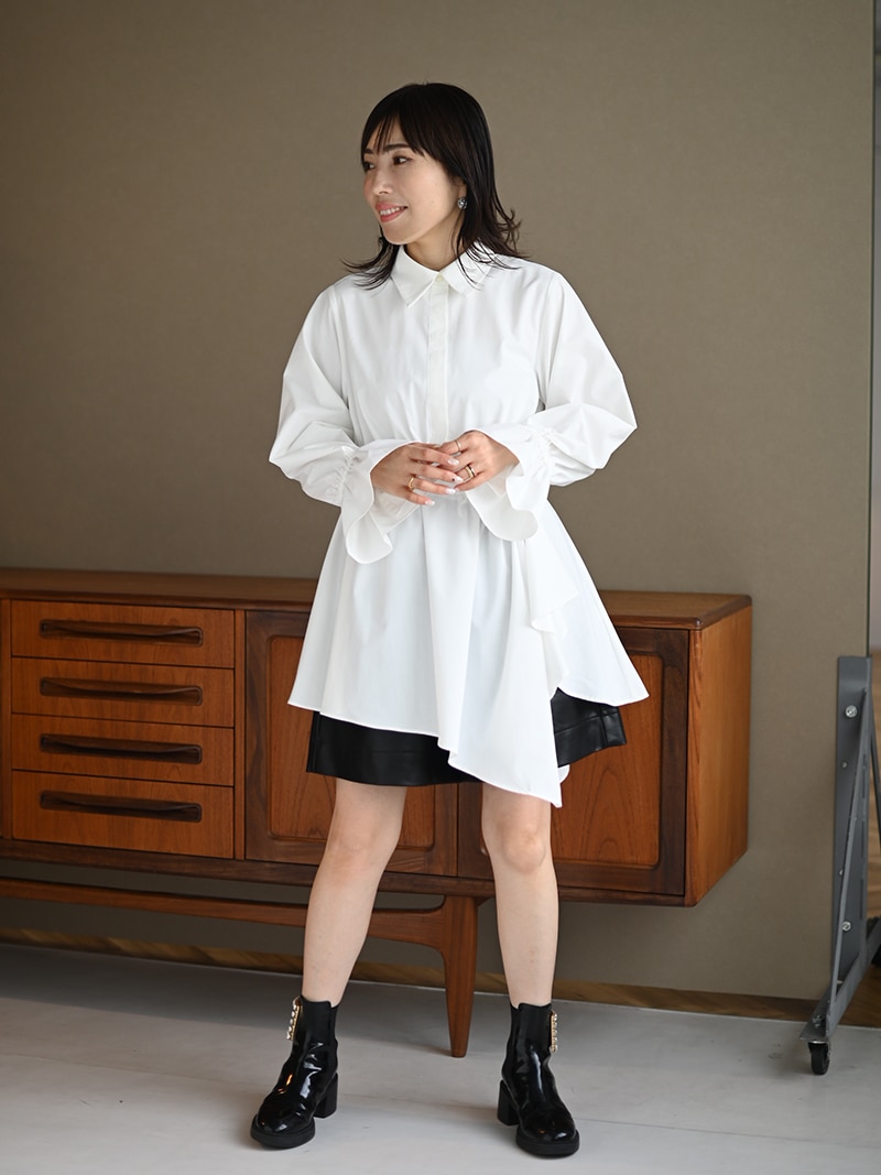 アシンメトリーヘムや構築的なシルエットが存在感のあるデザインチュニック。裾にかけて広がるAラインシルエットでモード感がありながらも女性らしく着ていただけます。