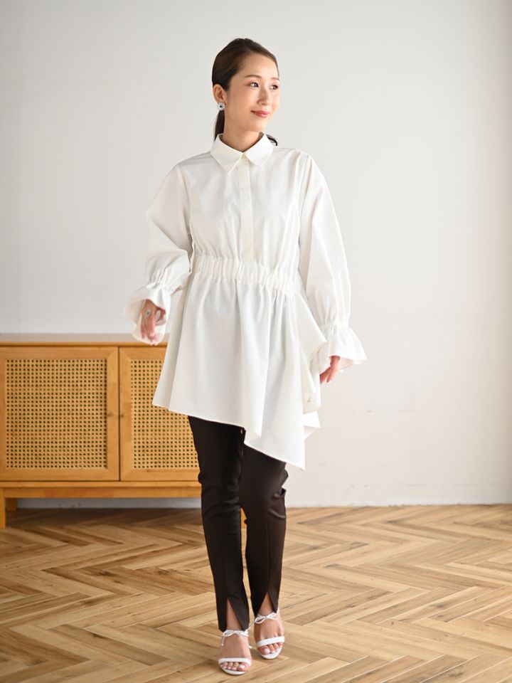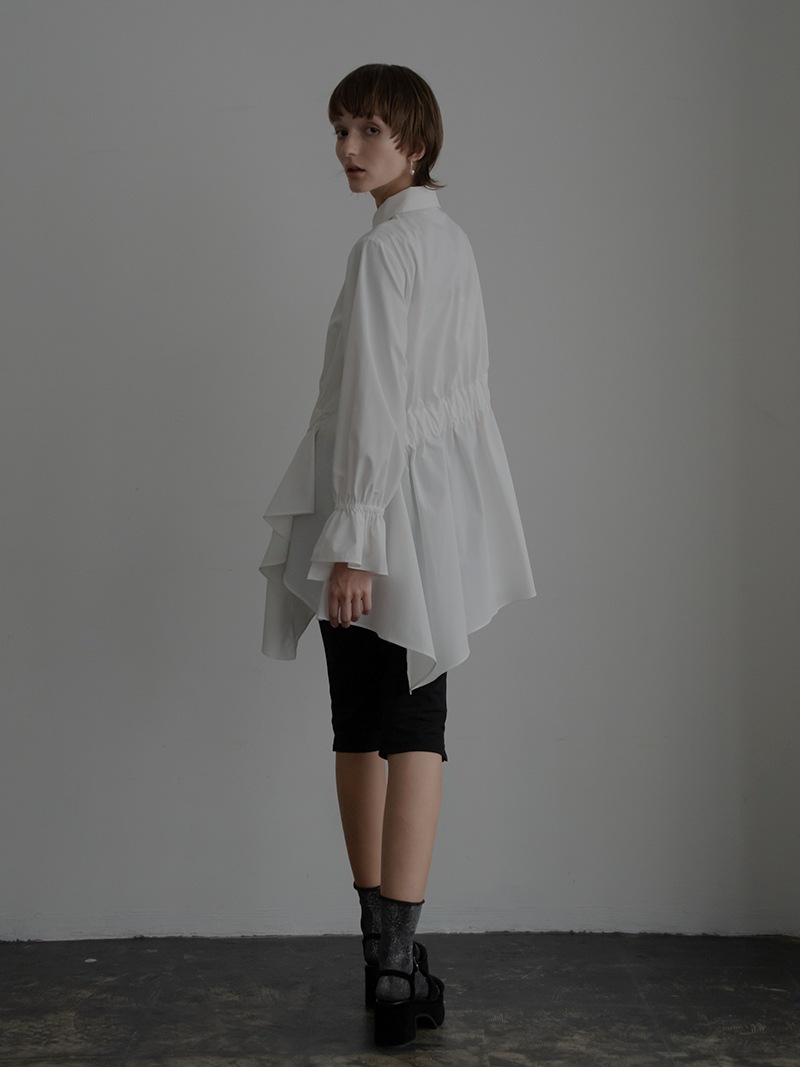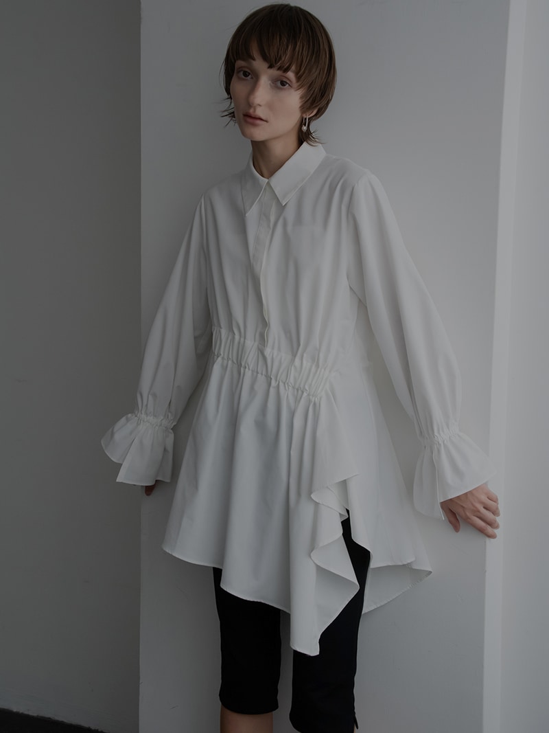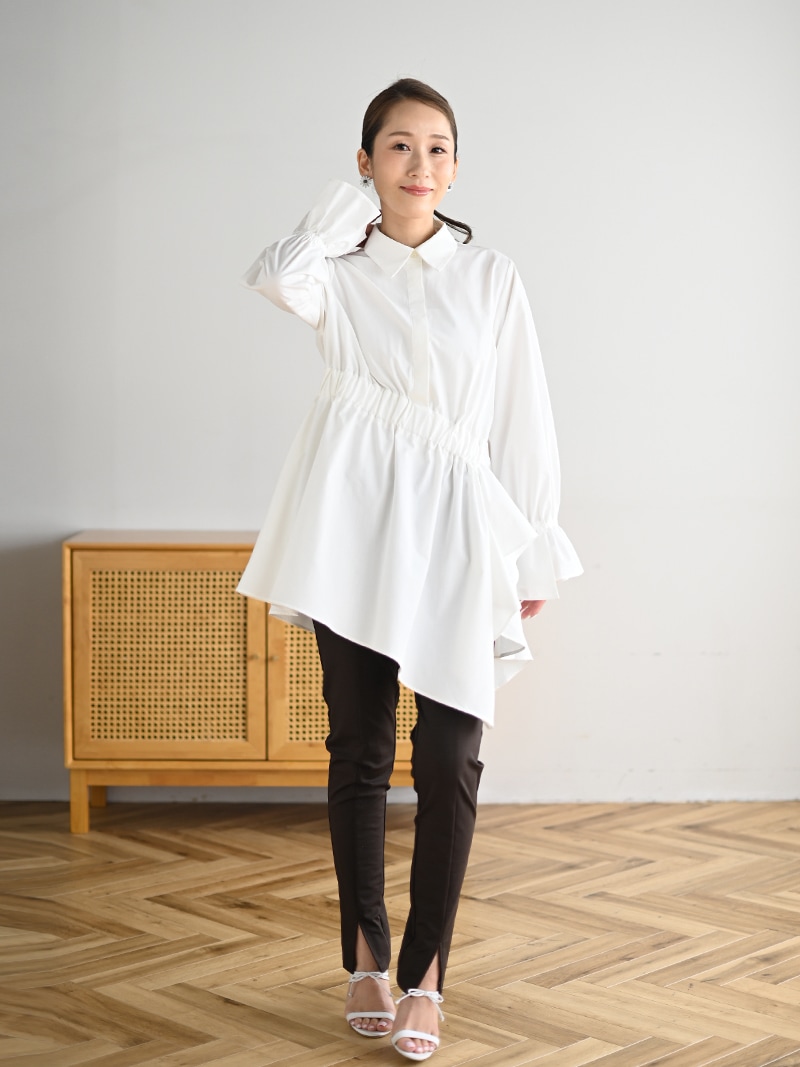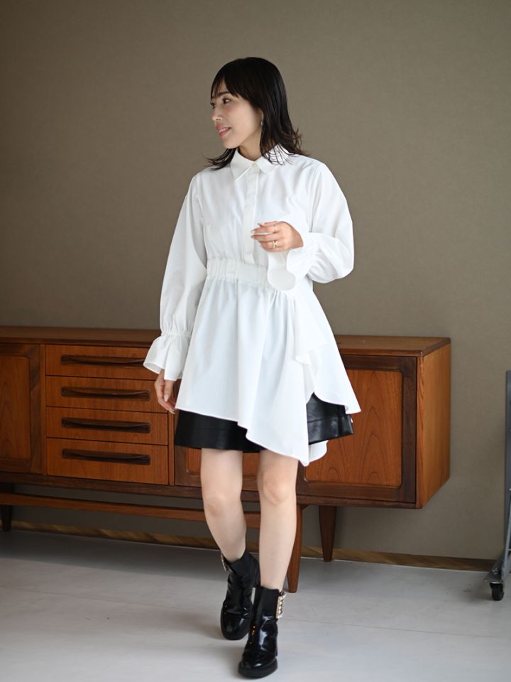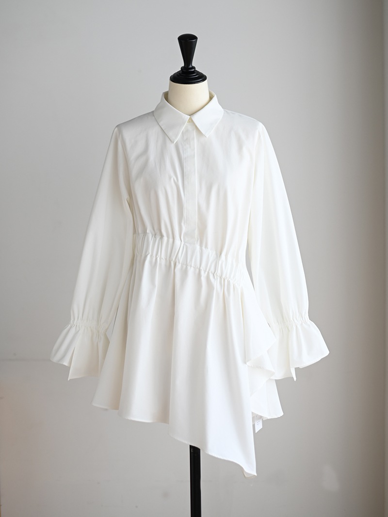 アシンメトリーヘムや構築的なシルエットが存在感のあるデザインチュニック。裾にかけて広がるAラインシルエットでモード感がありながらも女性らしく着ていただけます。
