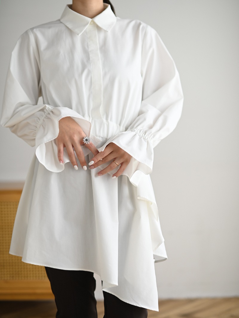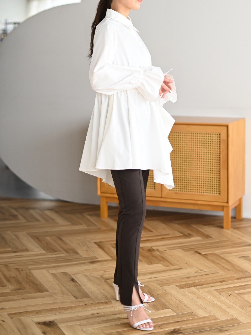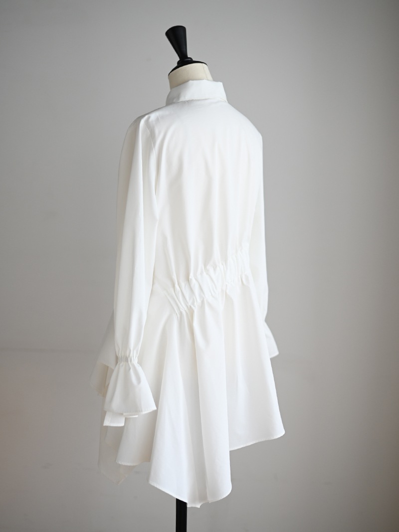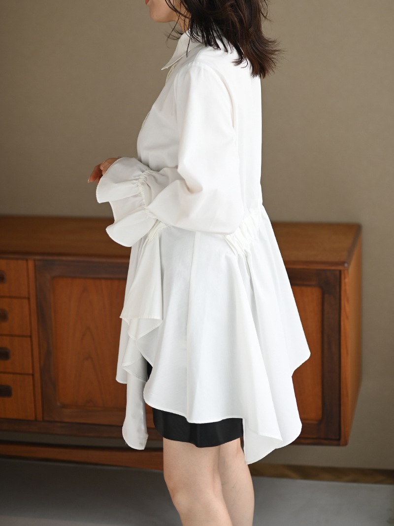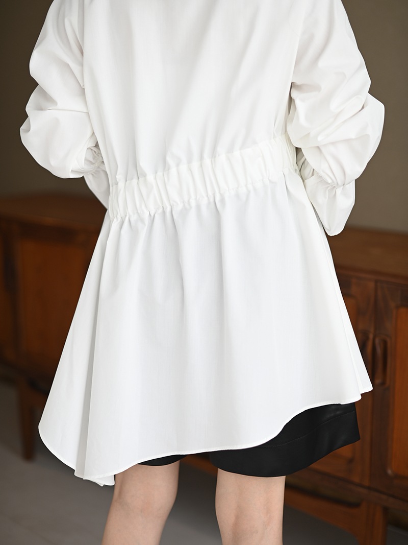 アシンメトリーヘムや構築的なシルエットが存在感のあるデザインチュニック。裾にかけて広がるAラインシルエットでモード感がありながらも女性らしく着ていただけます。