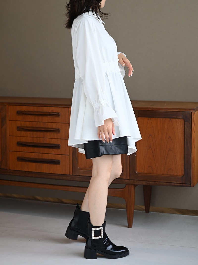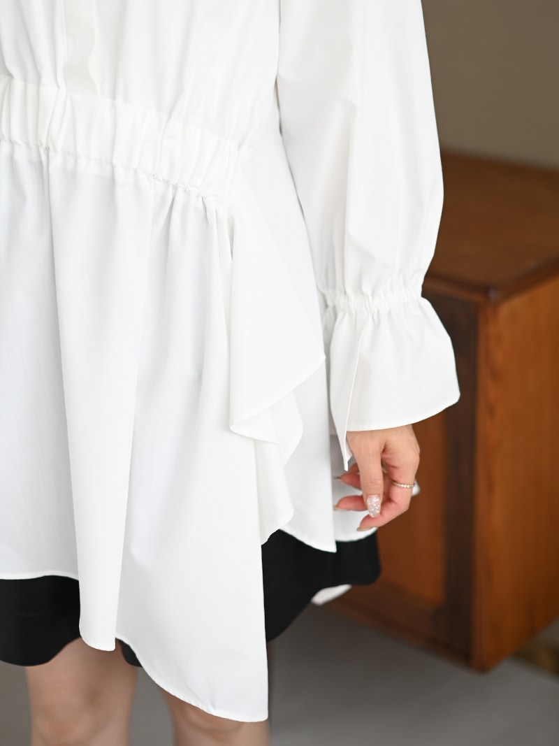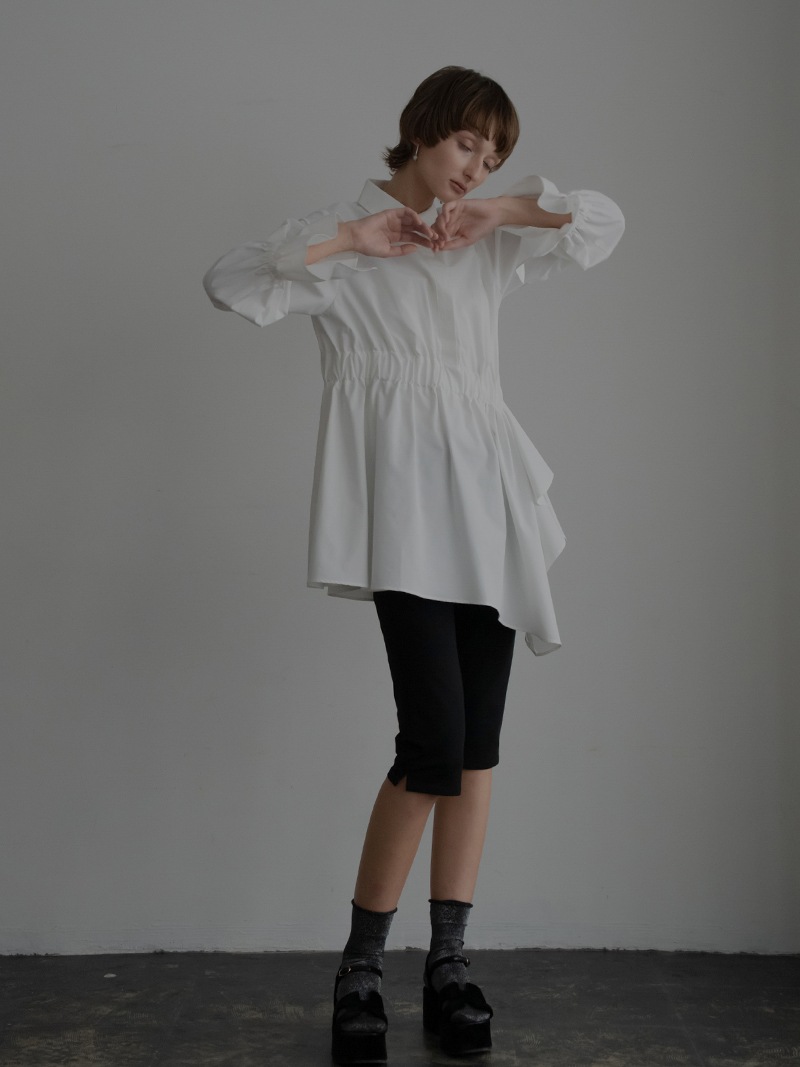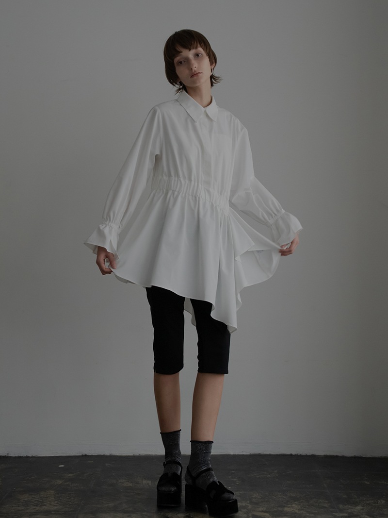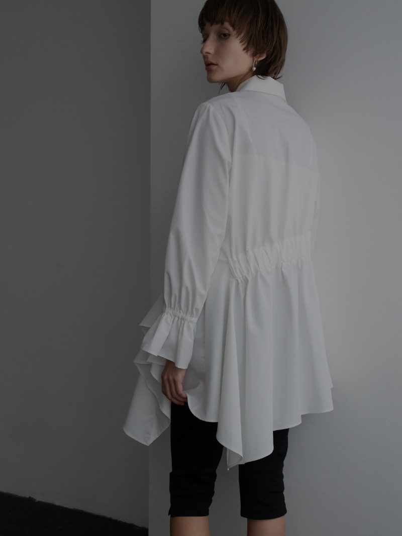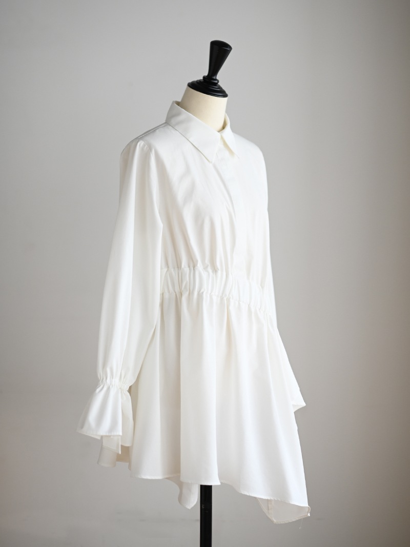 アシンメトリーヘムや構築的なシルエットが存在感のあるデザインチュニック。裾にかけて広がるAラインシルエットでモード感がありながらも女性らしく着ていただけます。