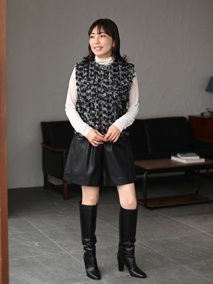 一点投入するだけで春のムードを高めてくれるツイードベスト。リボンヤーンをふんだんに織り込んだ、華やかな表情のツイードを使用。