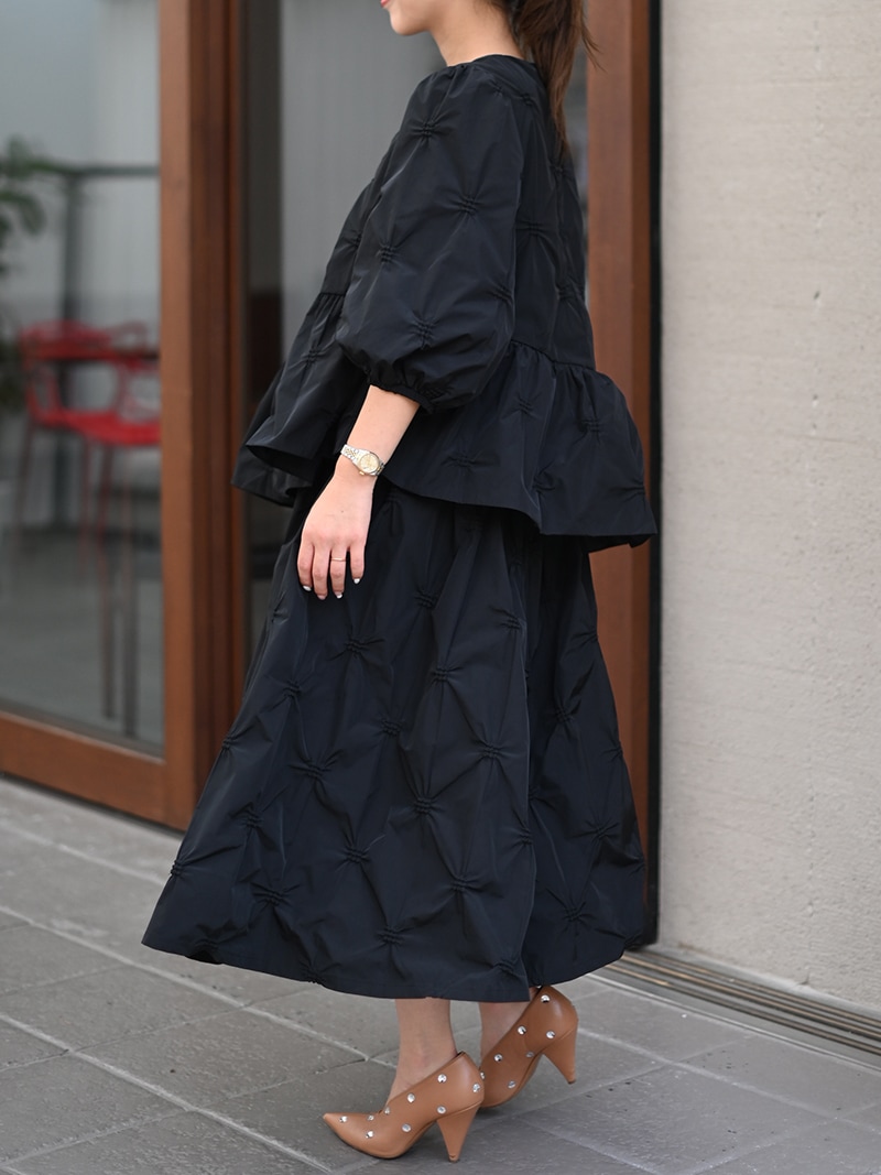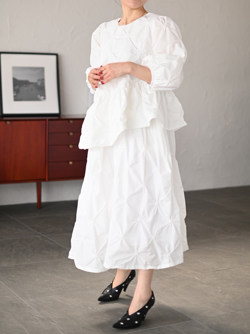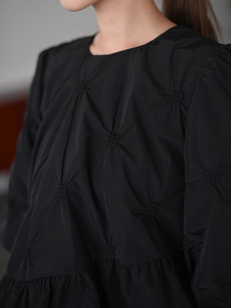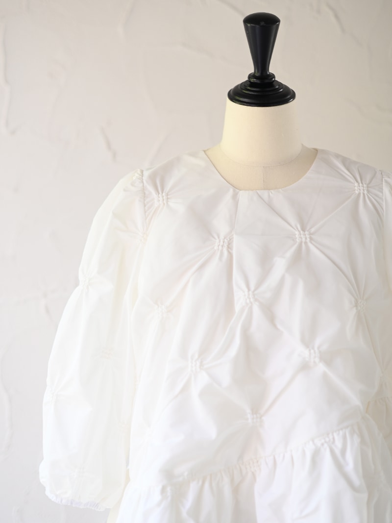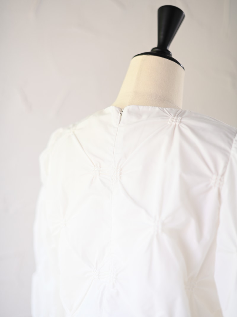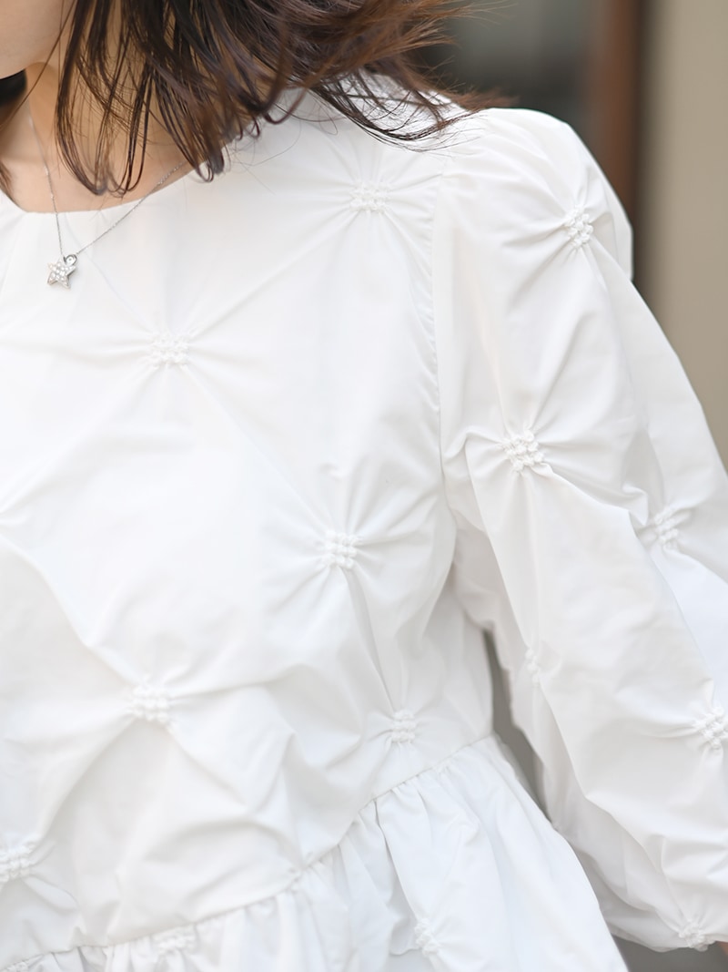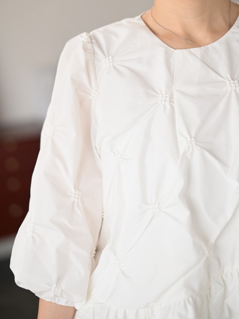 スモッキングによる立体感がアクセントの1枚でも着映えするアイテム。程よいツヤとハリのある生地を使用し、細かくギャザーを寄せ模様を施し作成したファブリック。