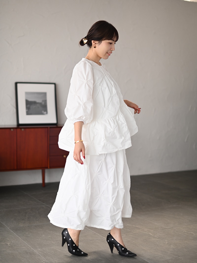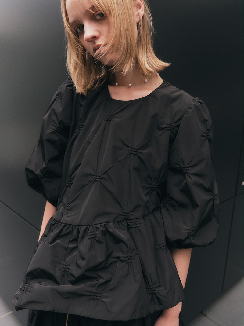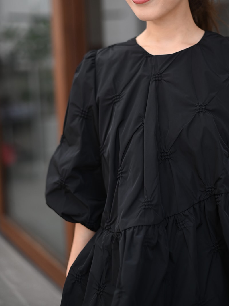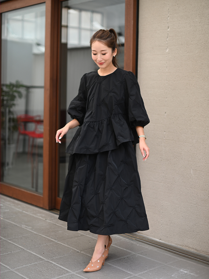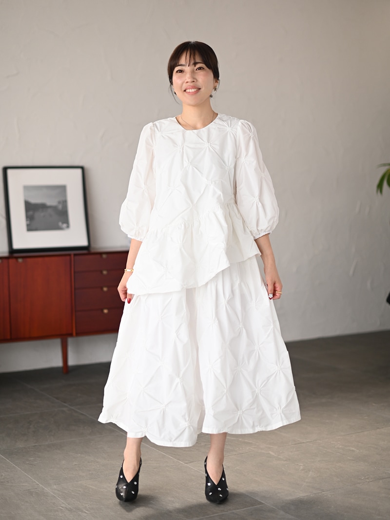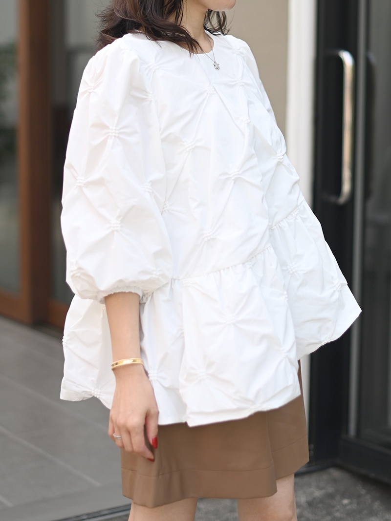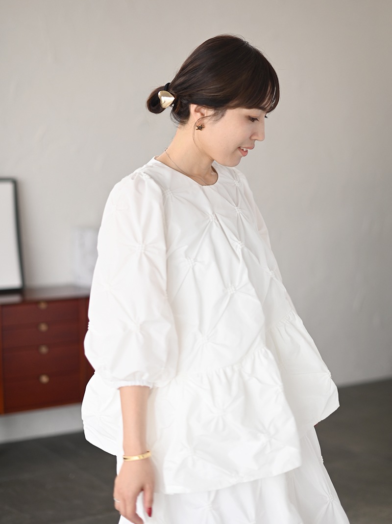 スモッキングによる立体感がアクセントの1枚でも着映えするアイテム。程よいツヤとハリのある生地を使用し、細かくギャザーを寄せ模様を施し作成したファブリック。