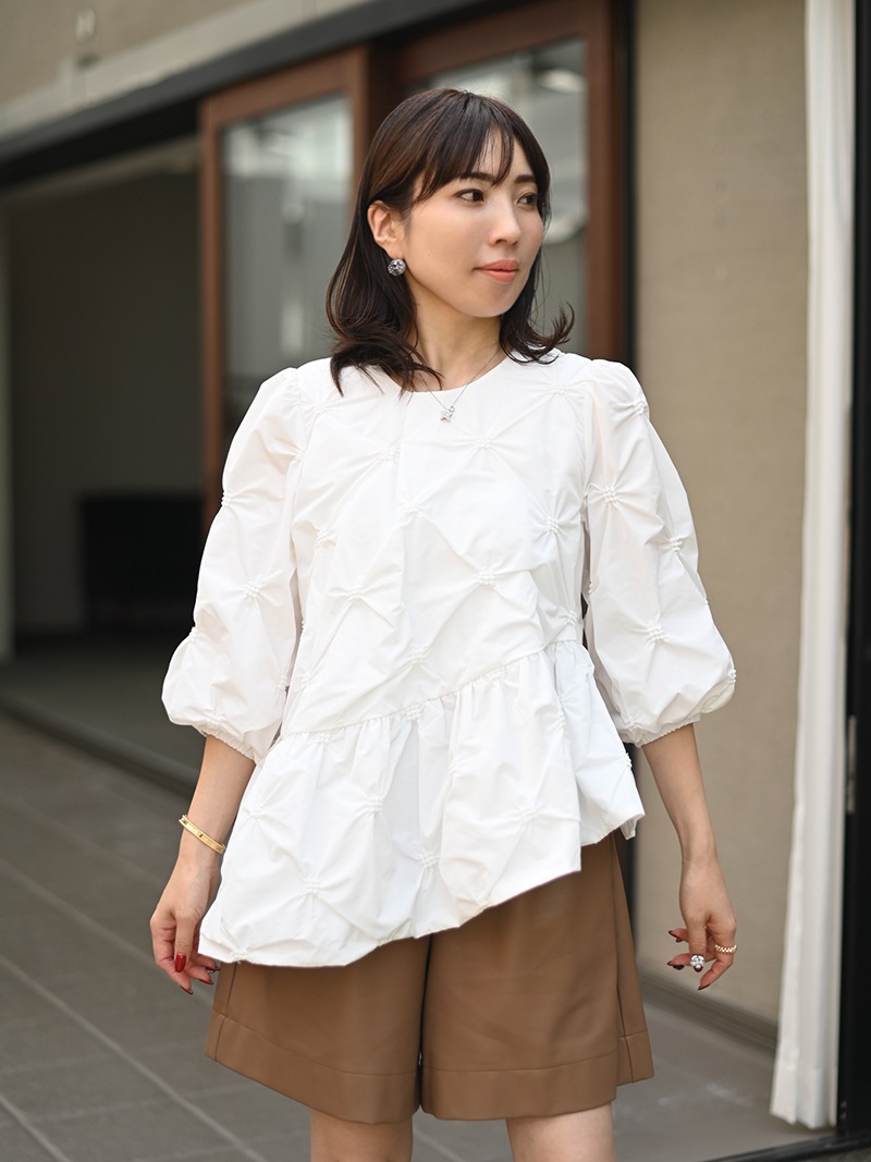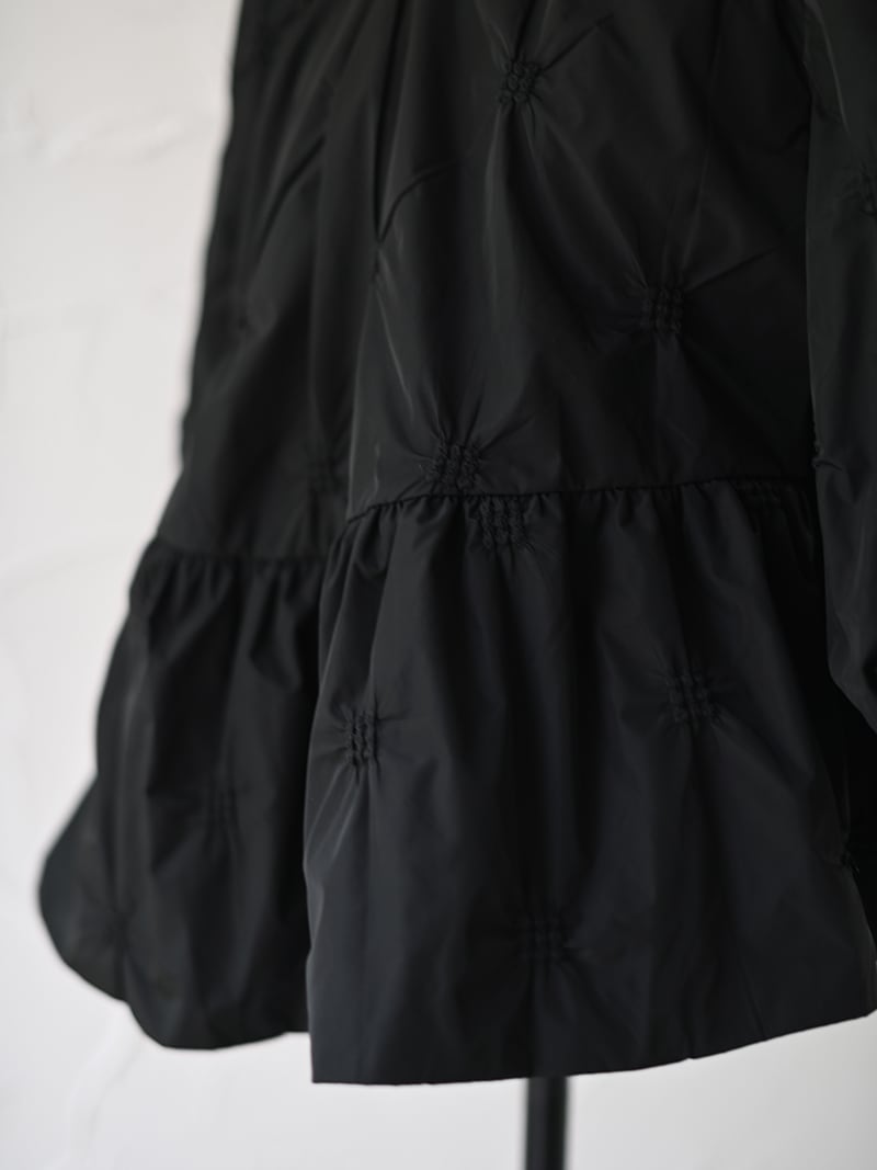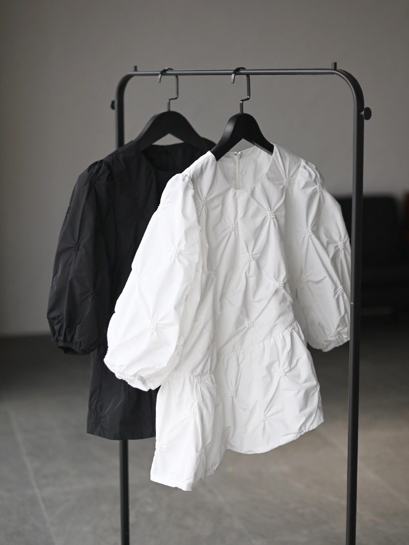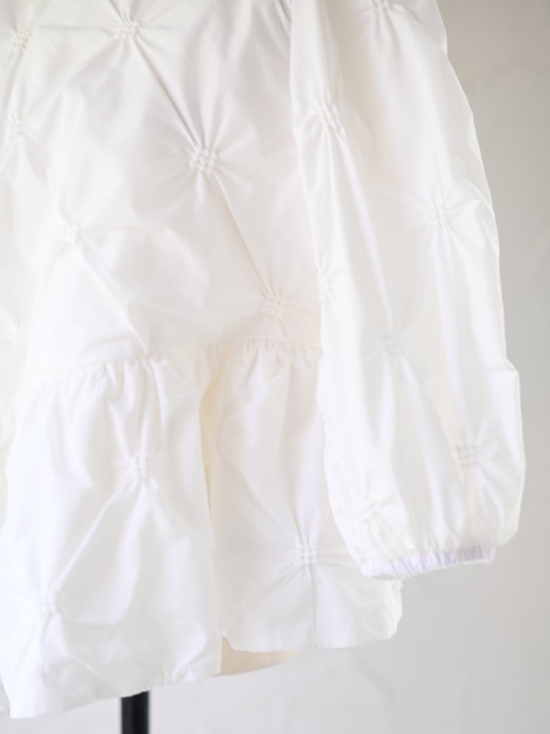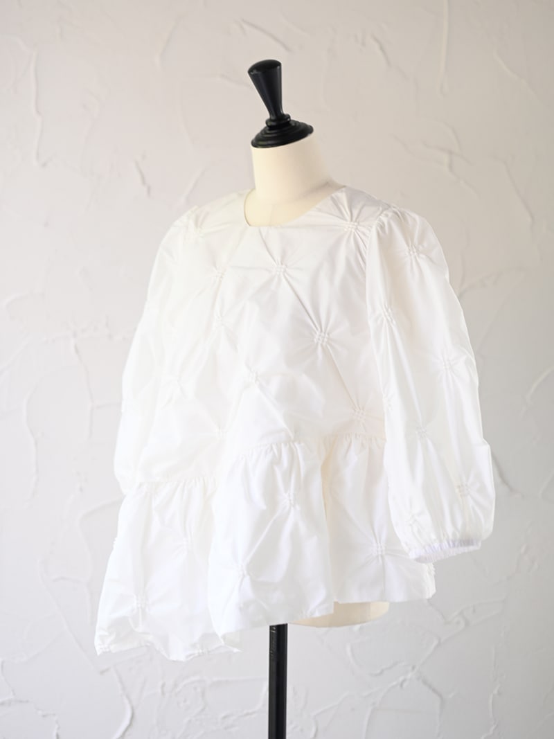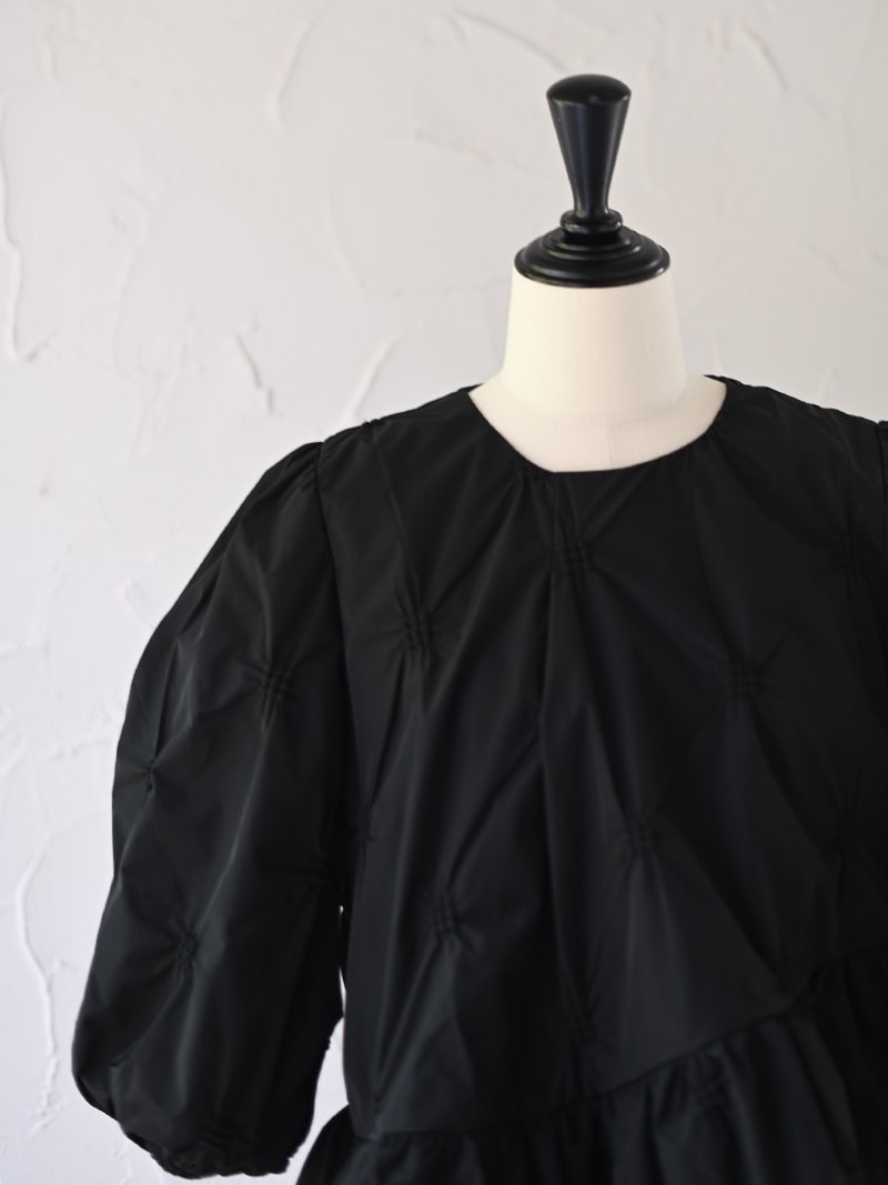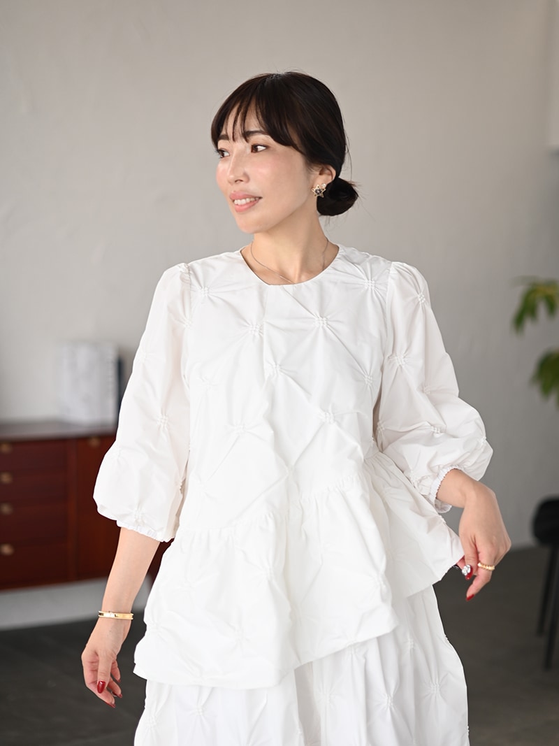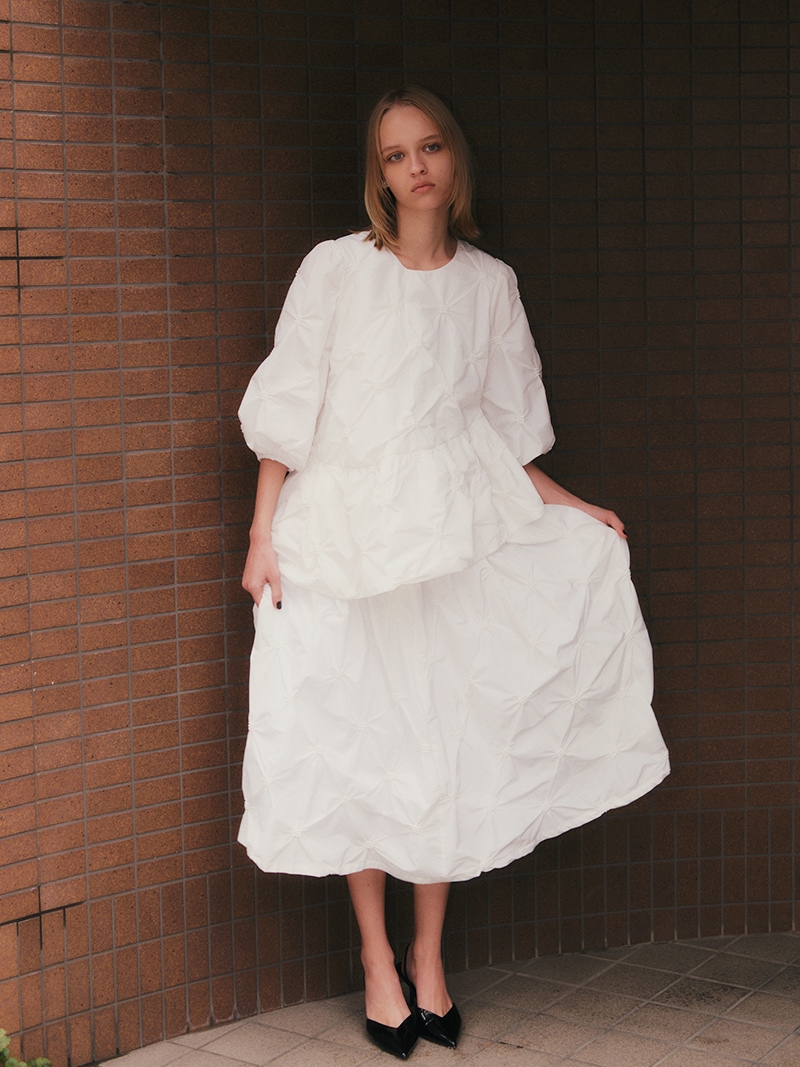 スモッキングによる立体感がアクセントの1枚でも着映えするアイテム。程よいツヤとハリのある生地を使用し、細かくギャザーを寄せ模様を施し作成したファブリック。