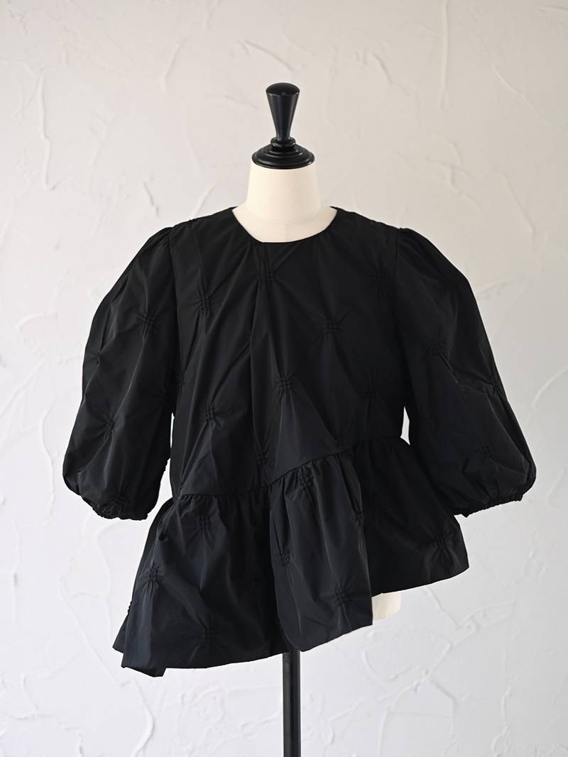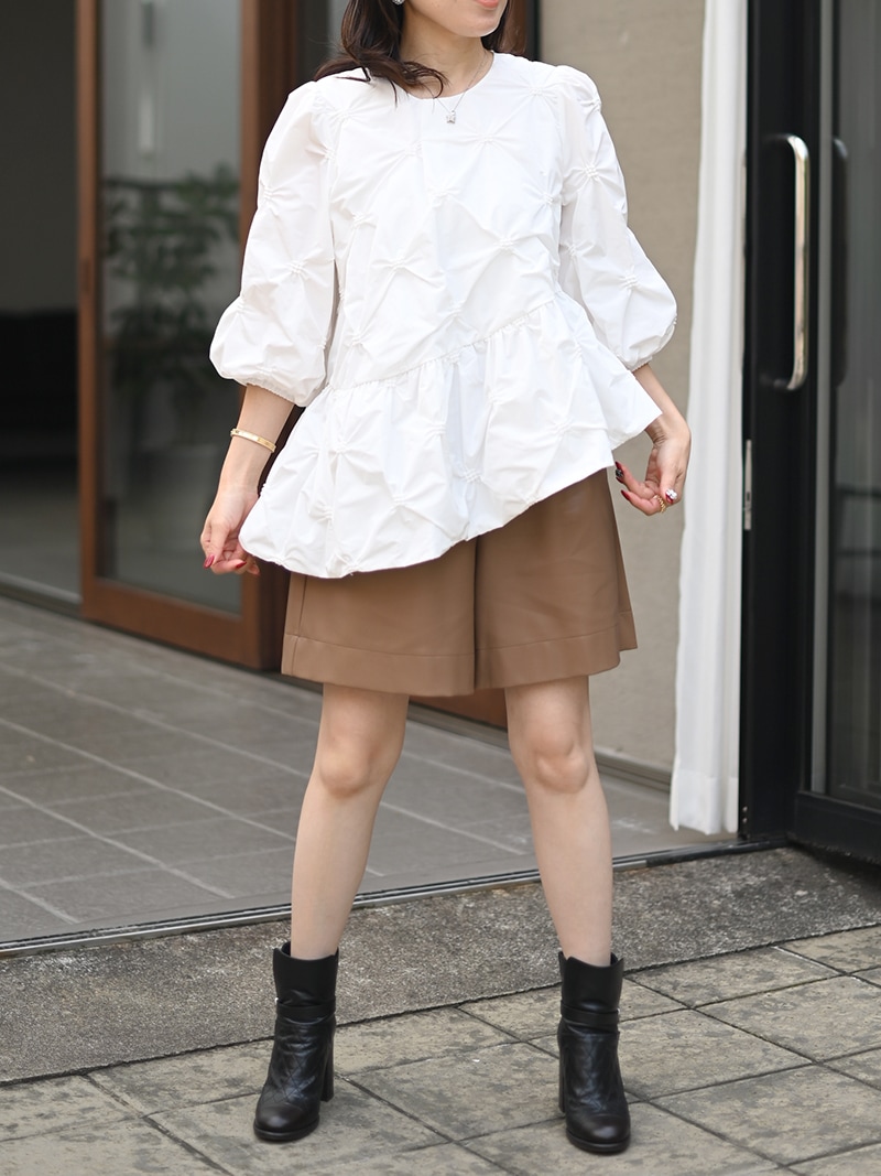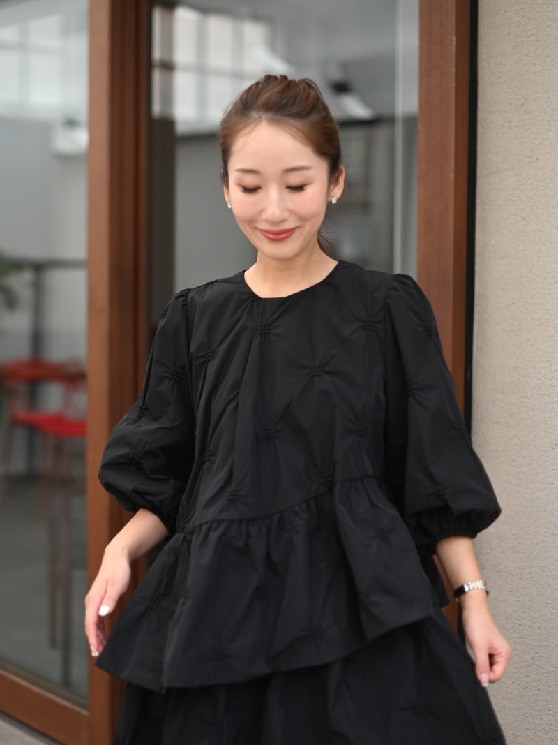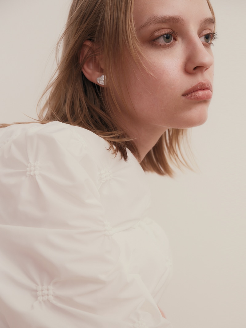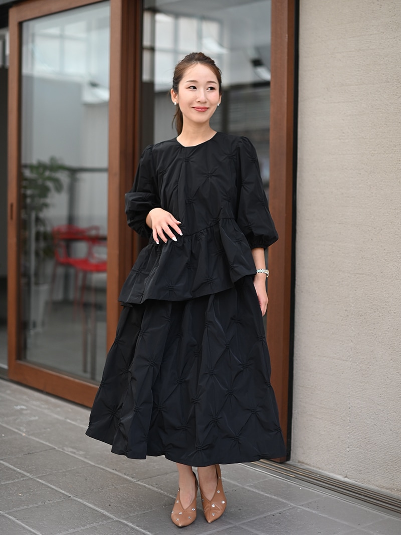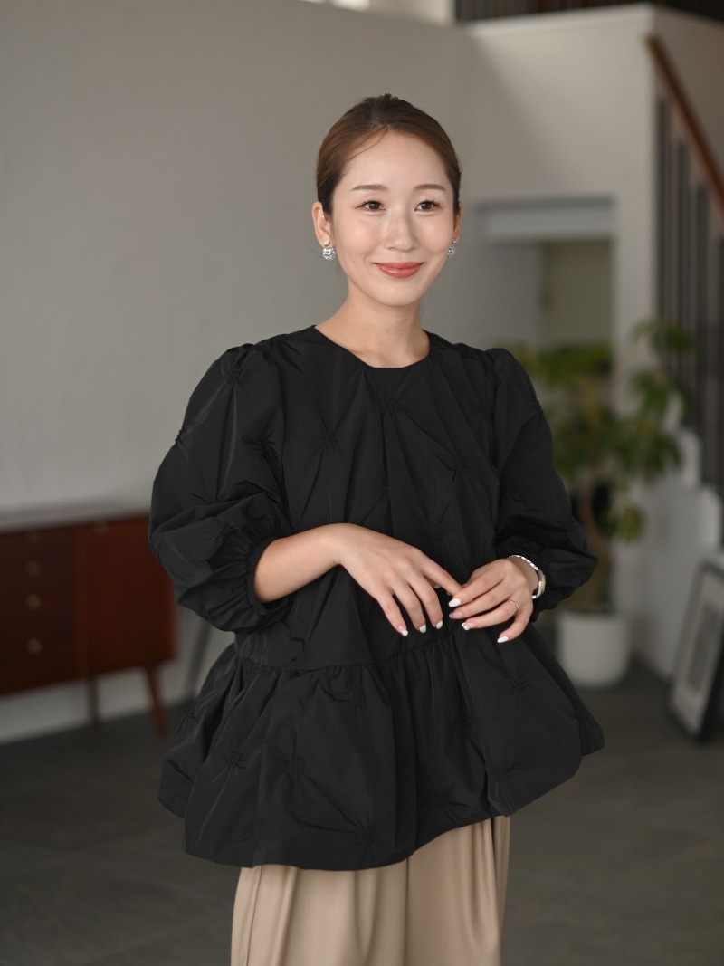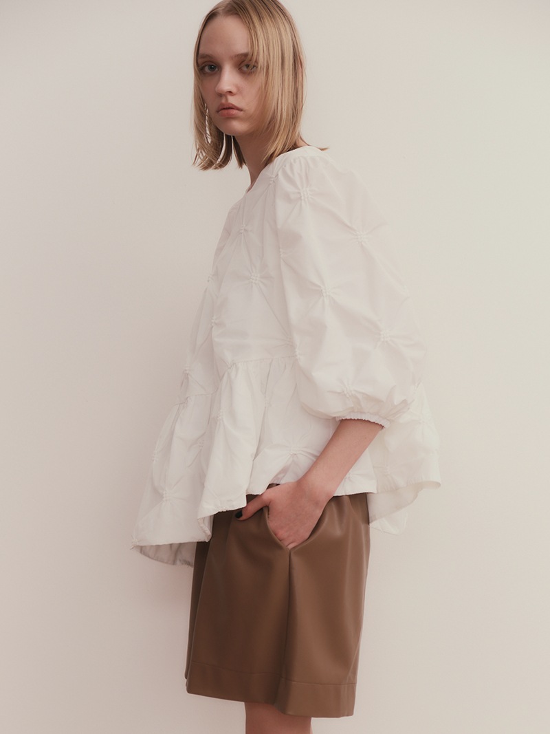 スモッキングによる立体感がアクセントの1枚でも着映えするアイテム。程よいツヤとハリのある生地を使用し、細かくギャザーを寄せ模様を施し作成したファブリック。