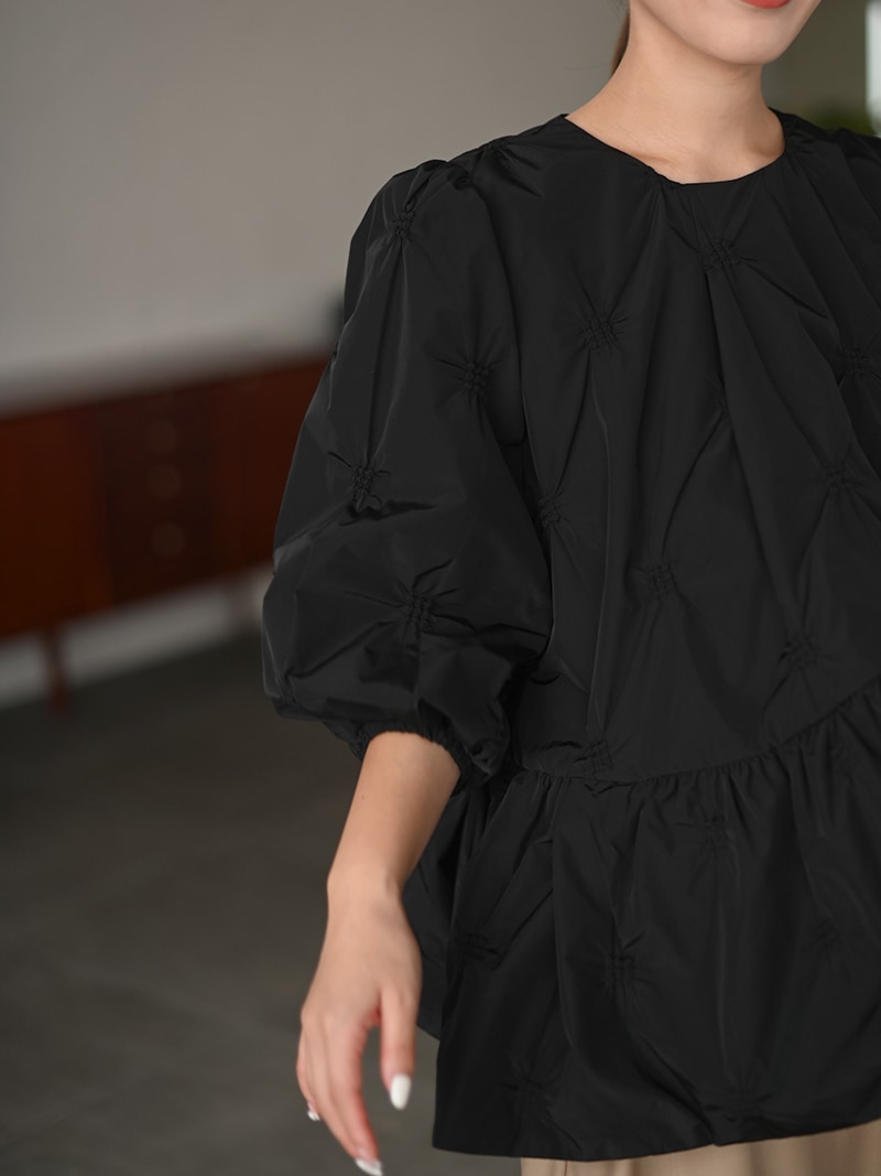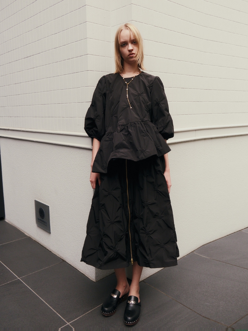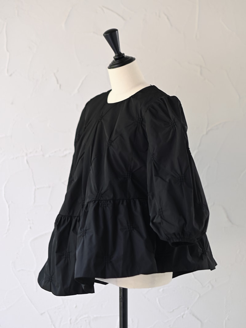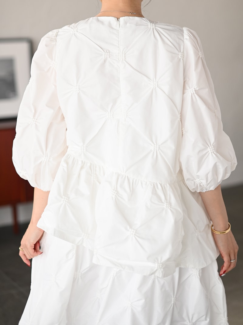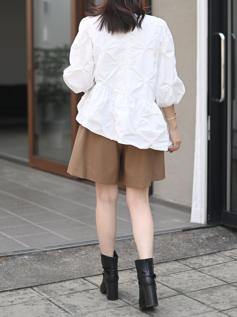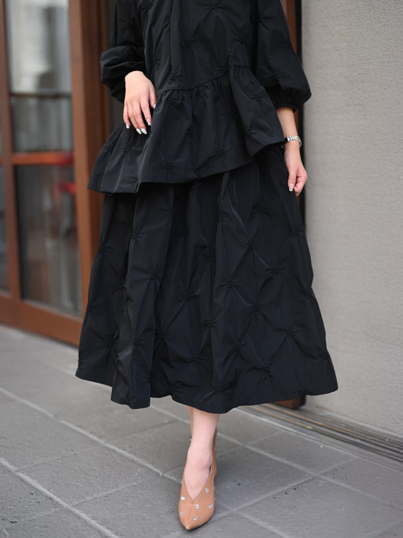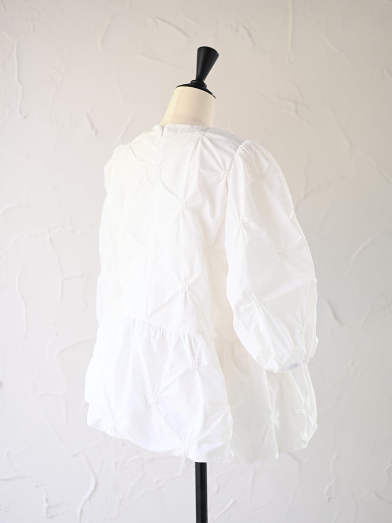 スモッキングによる立体感がアクセントの1枚でも着映えするアイテム。程よいツヤとハリのある生地を使用し、細かくギャザーを寄せ模様を施し作成したファブリック。