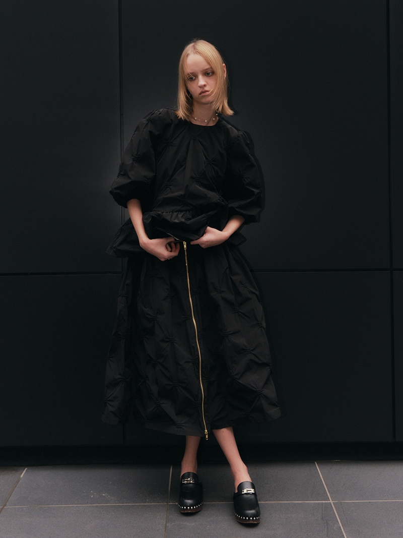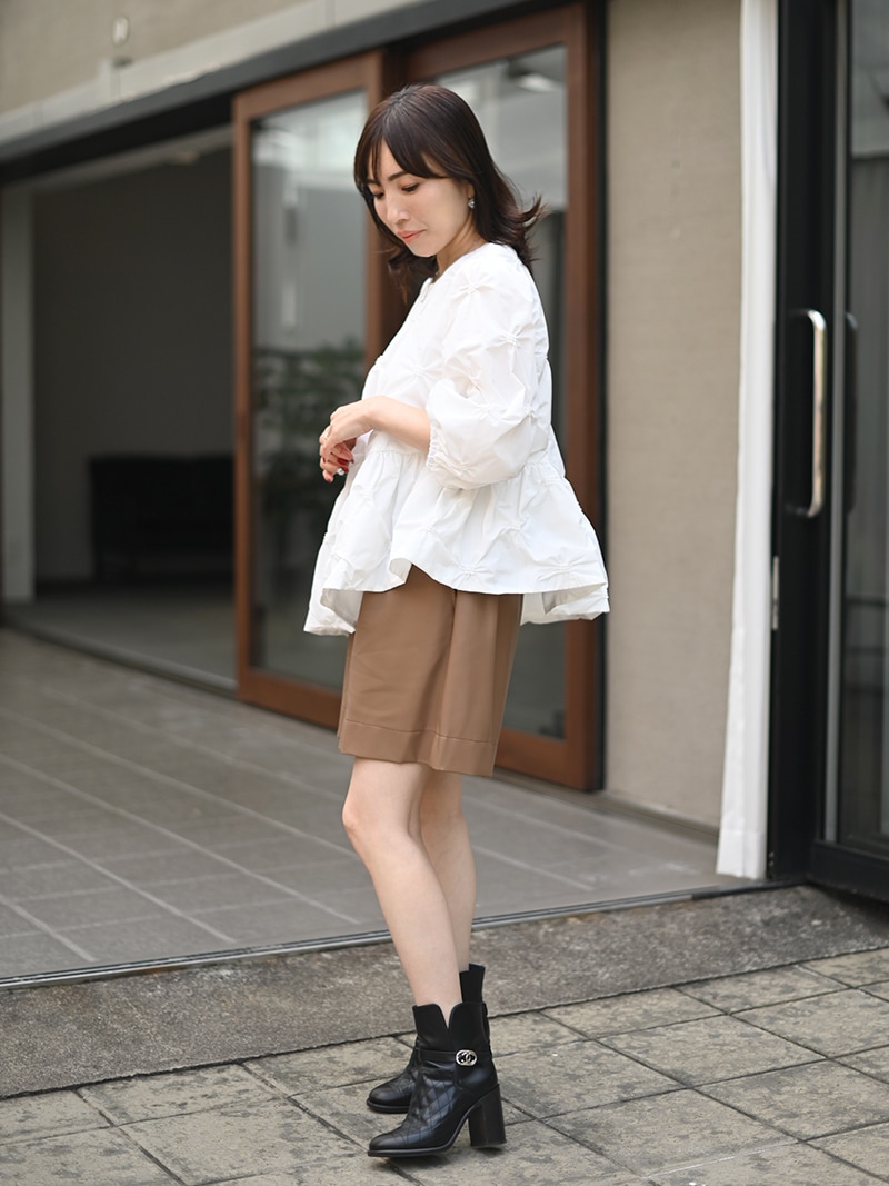 ハリ感を活かした裾のアシンメトリーデザインは甘くなりすぎないモードな雰囲気にも。