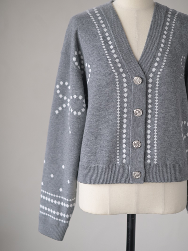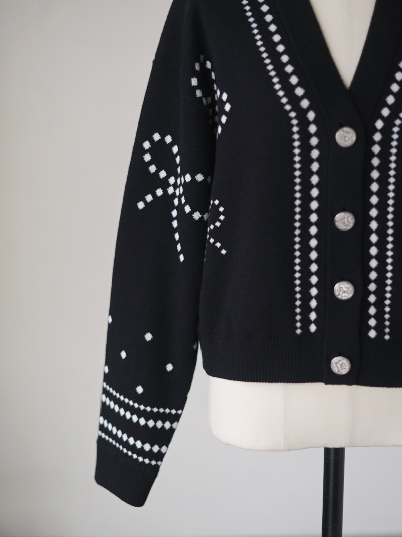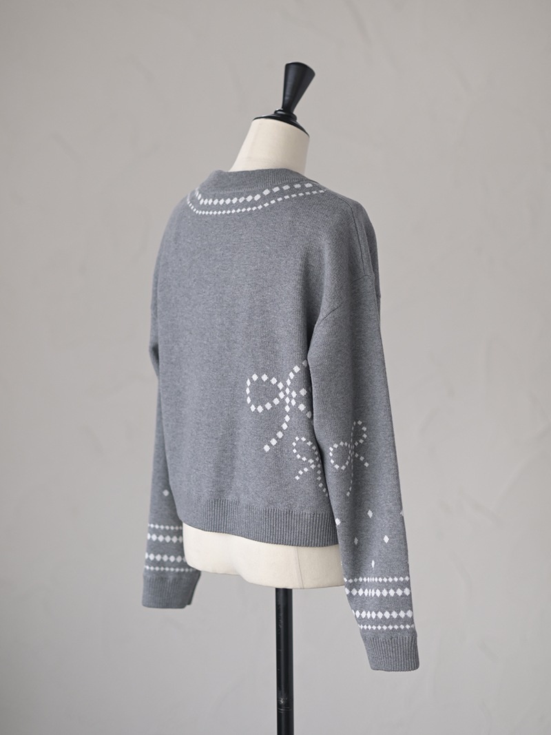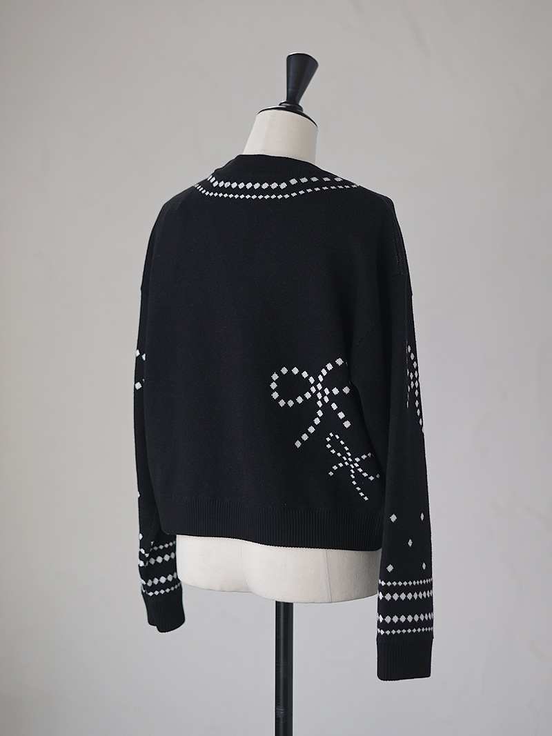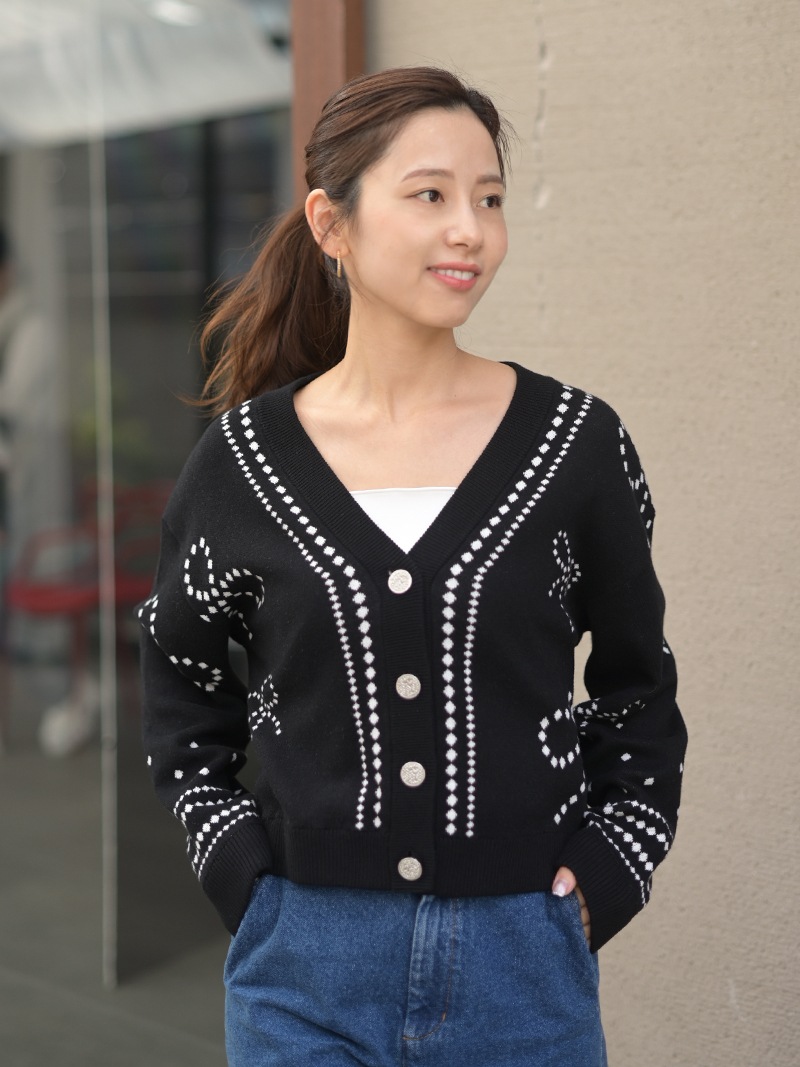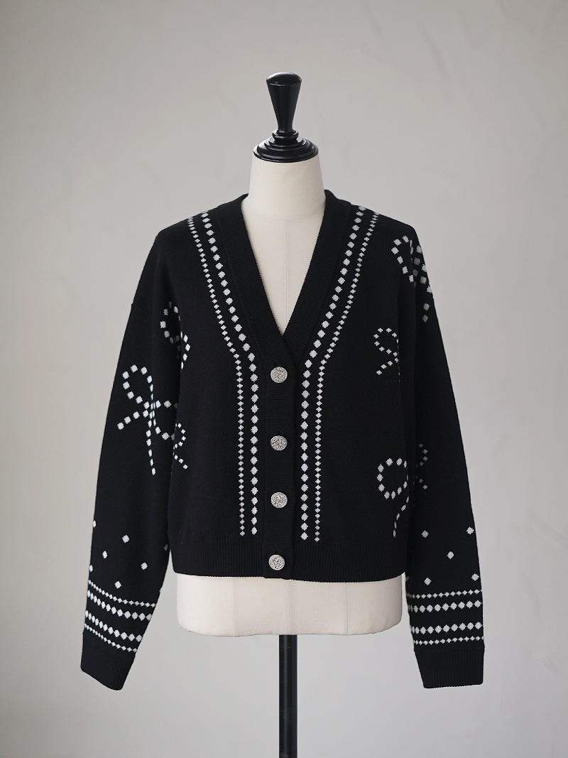 リボンモチーフをさりげなく配した、ジャガードカーディガン。甘くなりがちなリボンをドットで描き落ち着いた品のあるデザインに仕上げました。