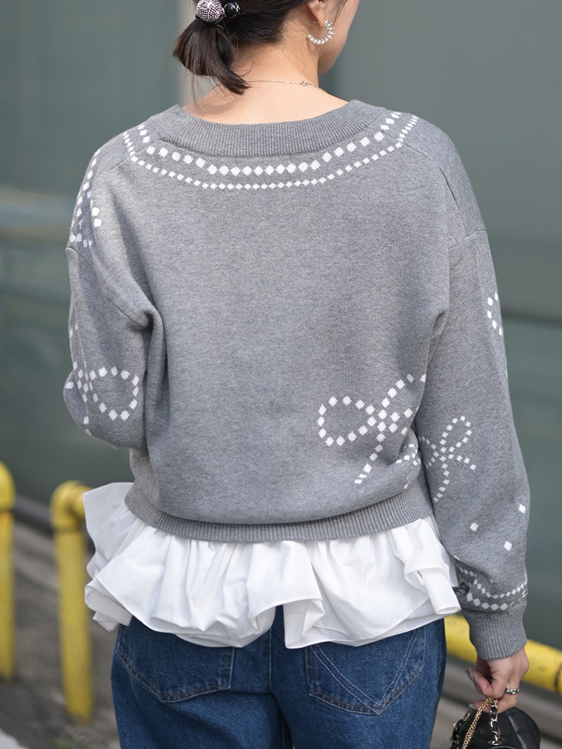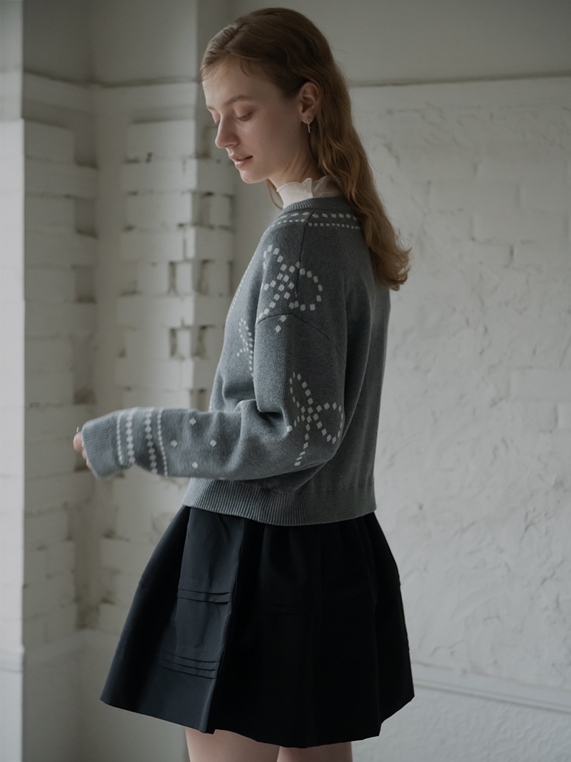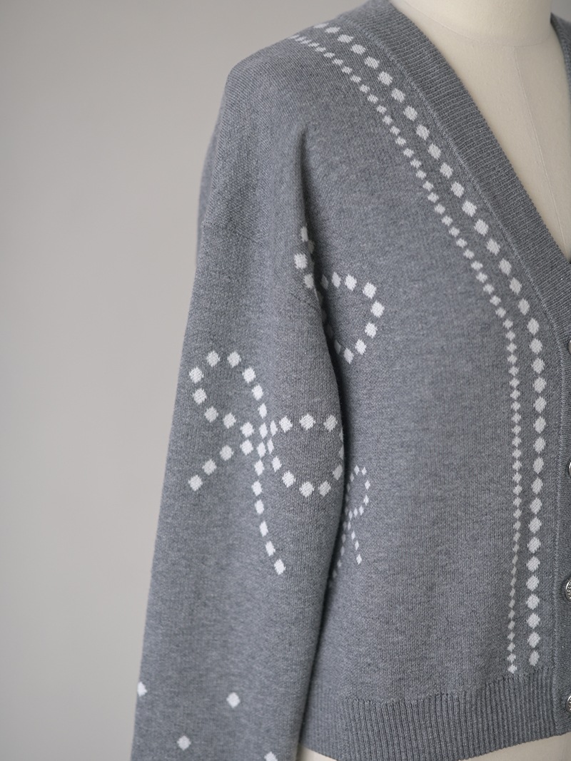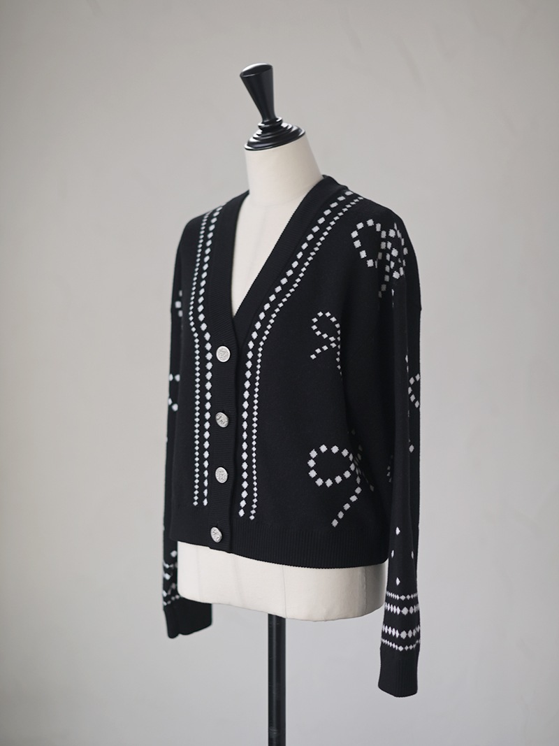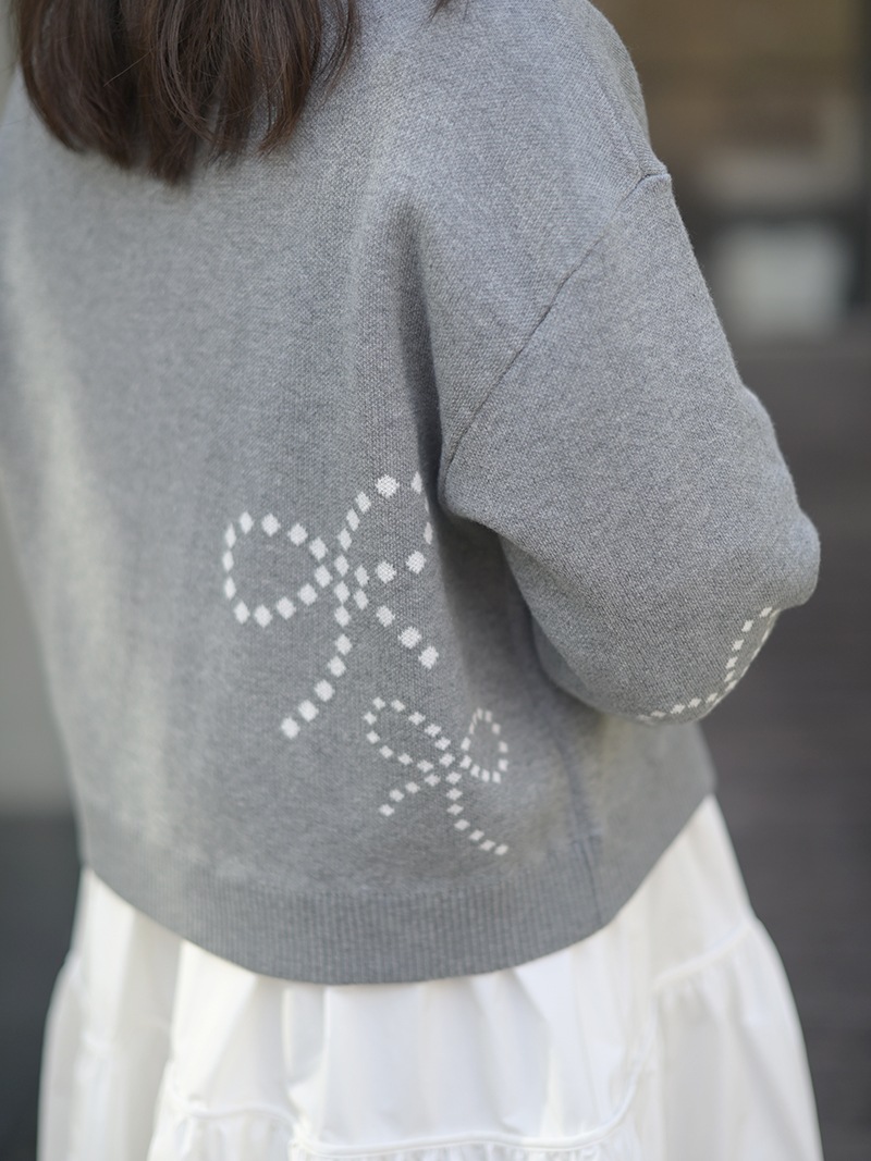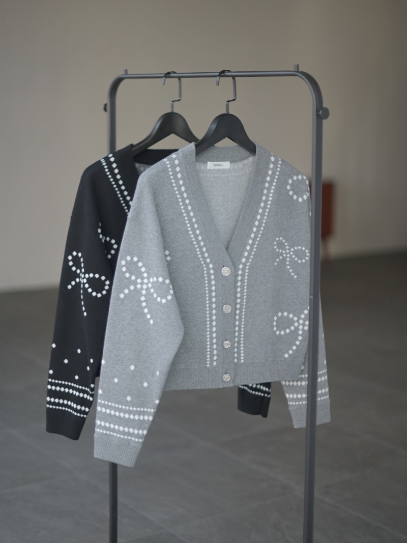 リボンモチーフをさりげなく配した、ジャガードカーディガン。甘くなりがちなリボンをドットで描き落ち着いた品のあるデザインに仕上げました。