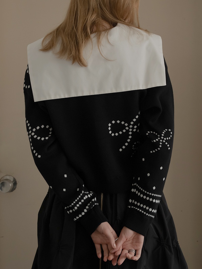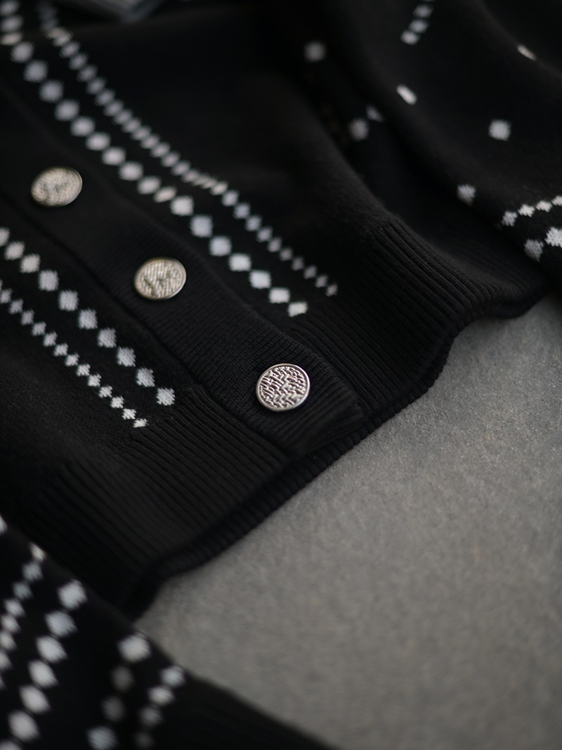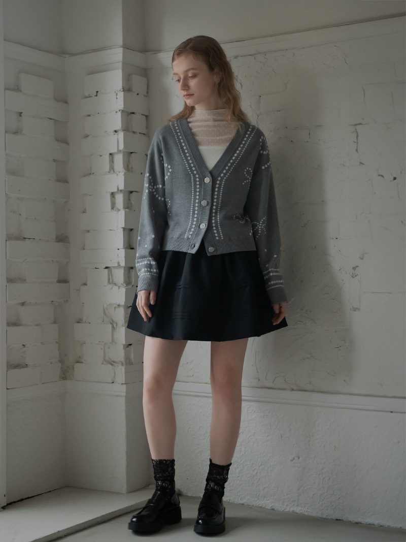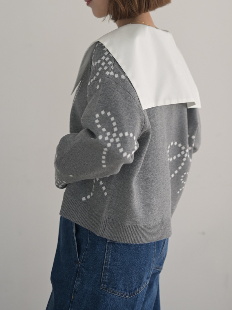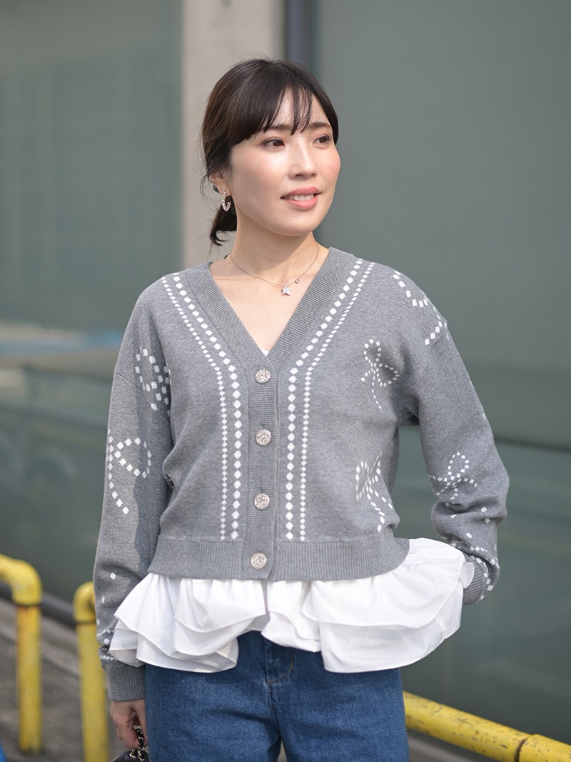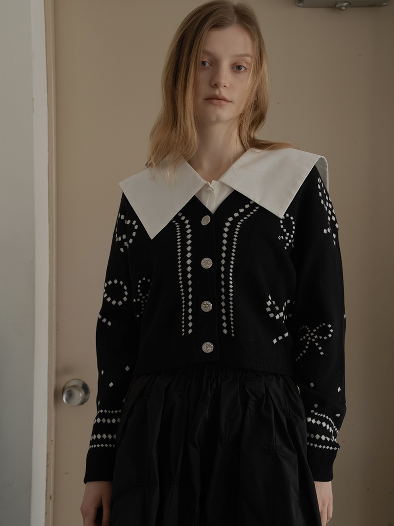 リボンモチーフをさりげなく配した、ジャガードカーディガン。甘くなりがちなリボンをドットで描き落ち着いた品のあるデザインに仕上げました。