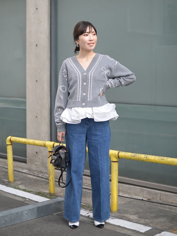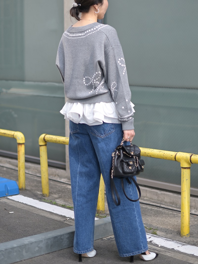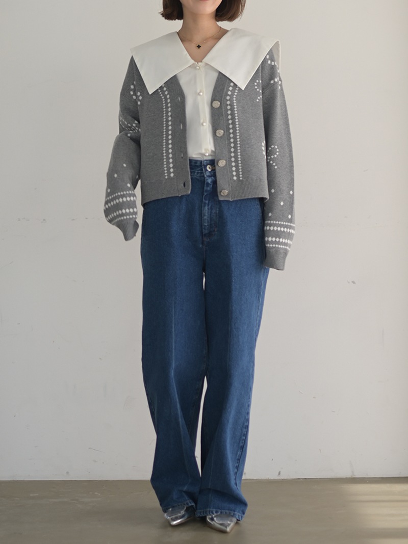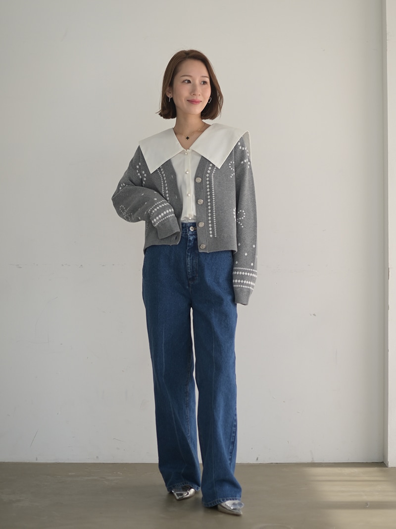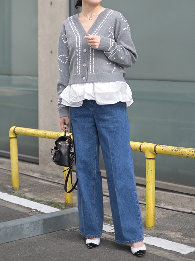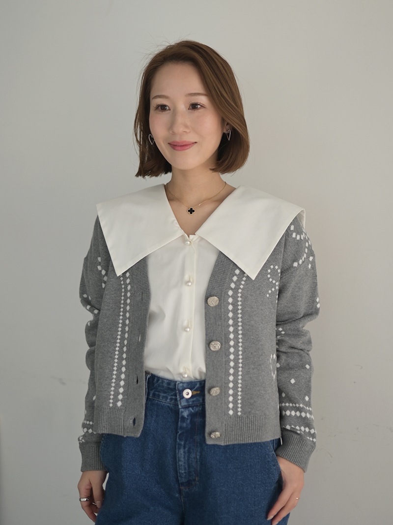 リボンモチーフをさりげなく配した、ジャガードカーディガン。甘くなりがちなリボンをドットで描き落ち着いた品のあるデザインに仕上げました。