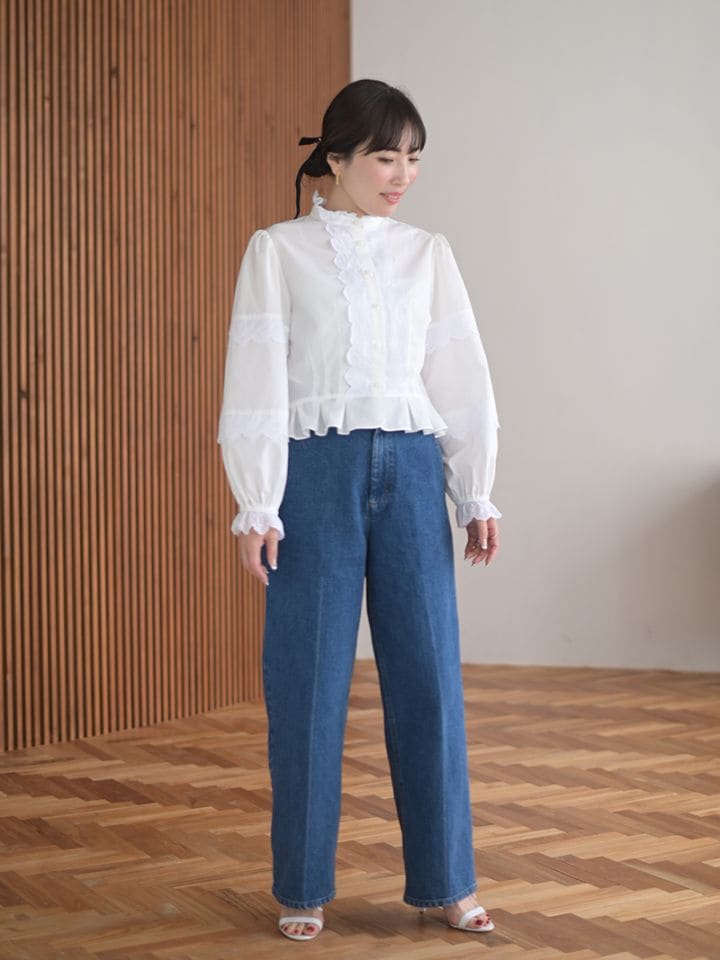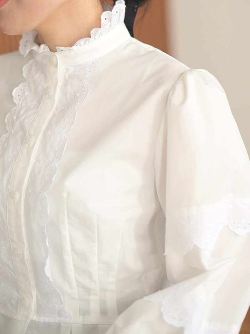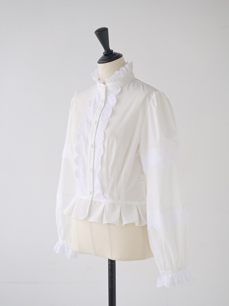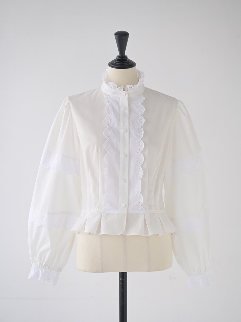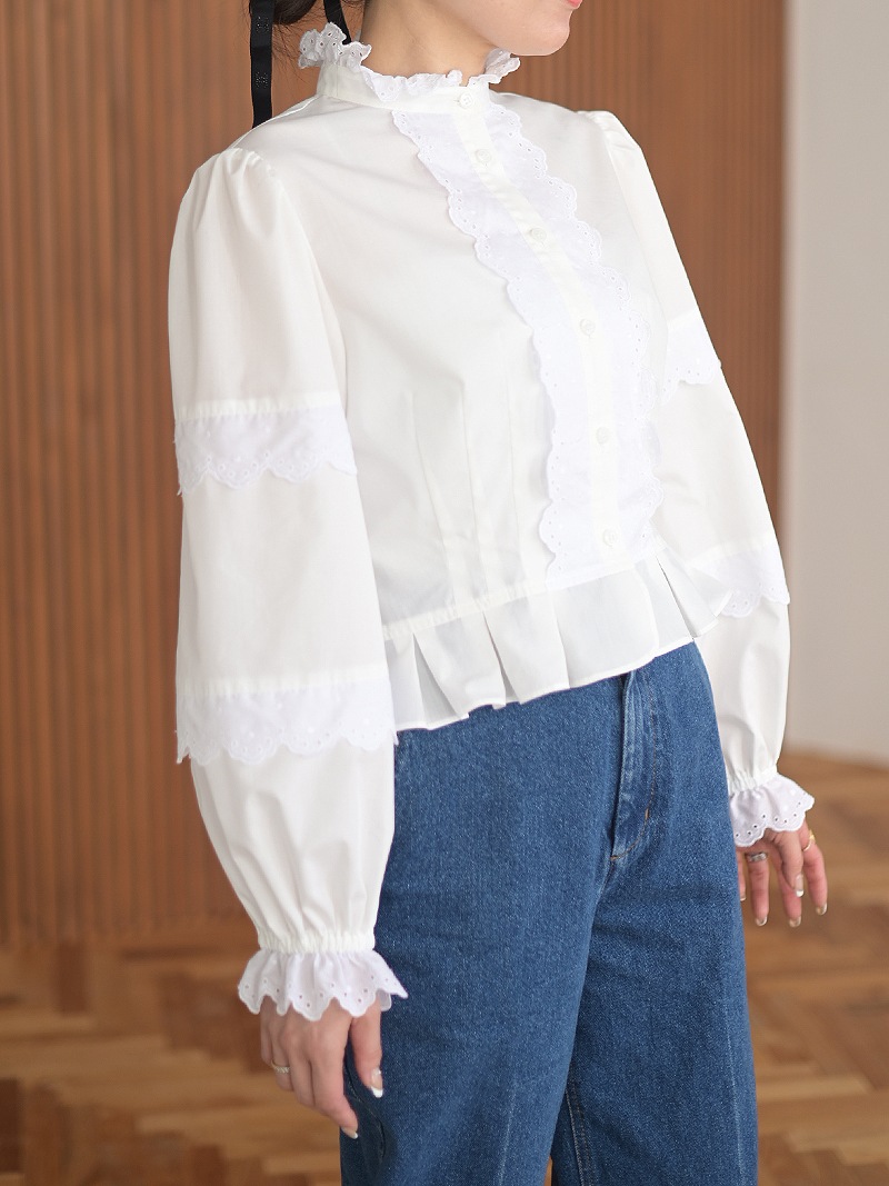 繊細なレースディテールが印象的なクラシカルブラウス。フロントに施したレースが縦のラインを強調し、甘さの中にすっきりとした表情をプラス。