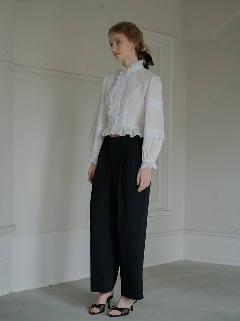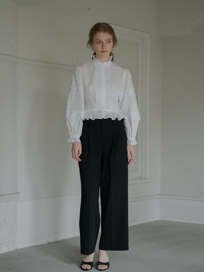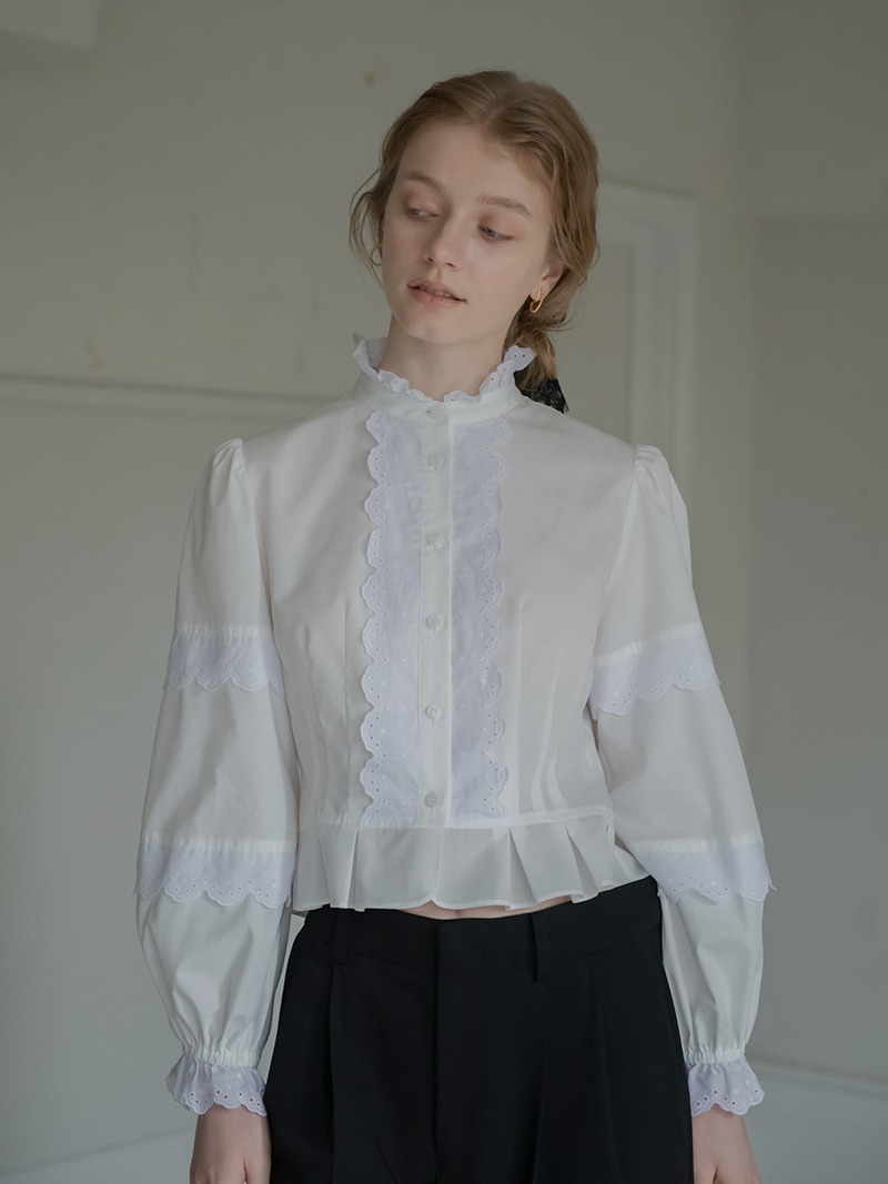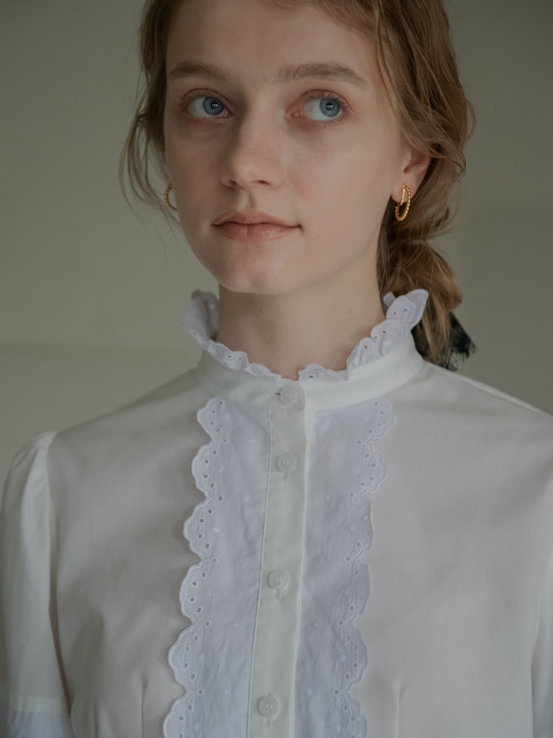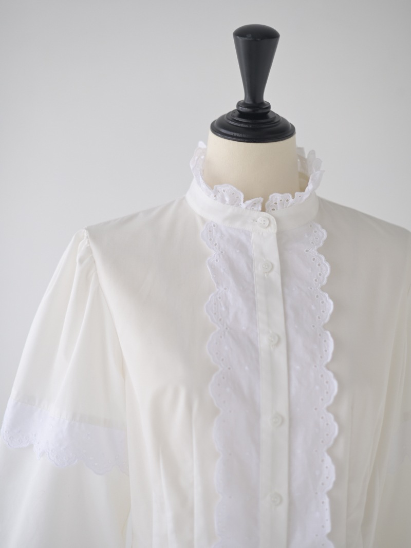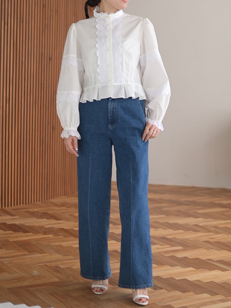 繊細なレースディテールが印象的なクラシカルブラウス。フロントに施したレースが縦のラインを強調し、甘さの中にすっきりとした表情をプラス。