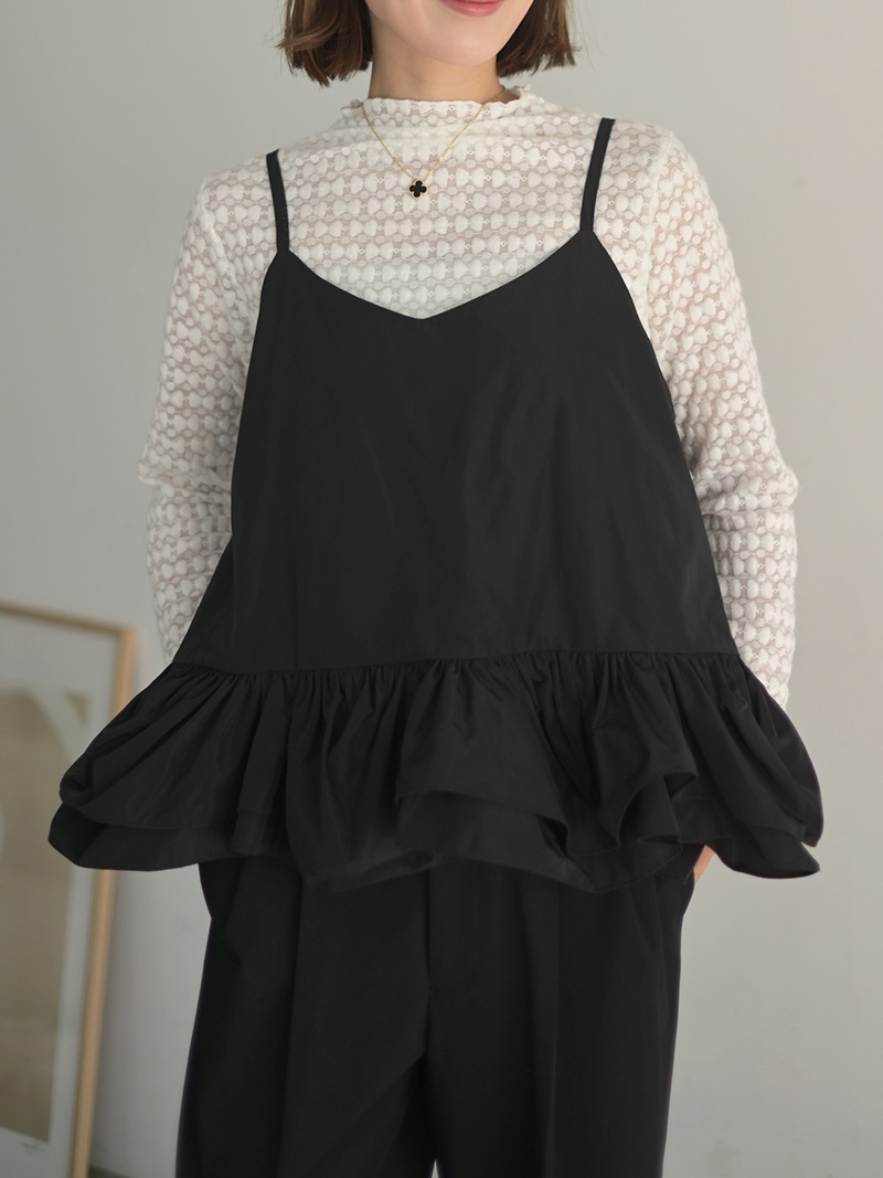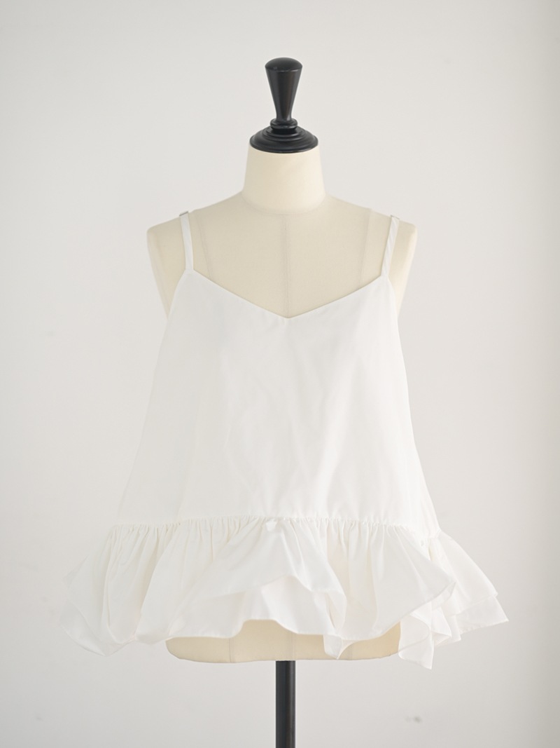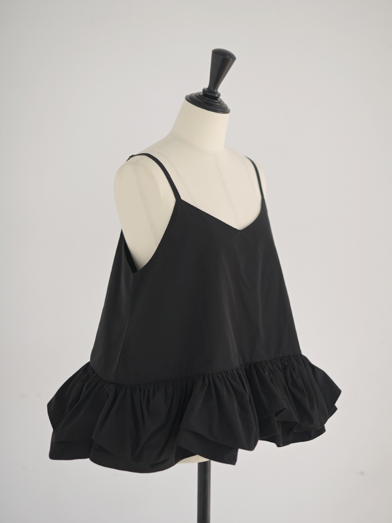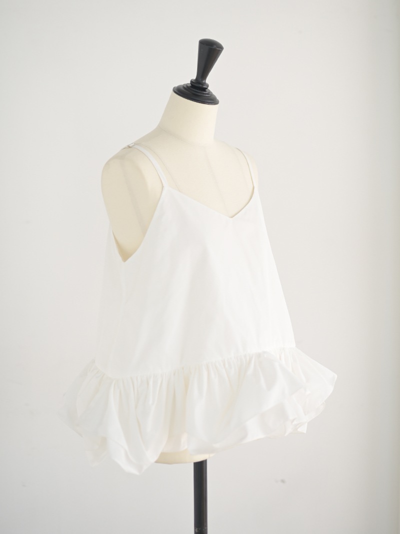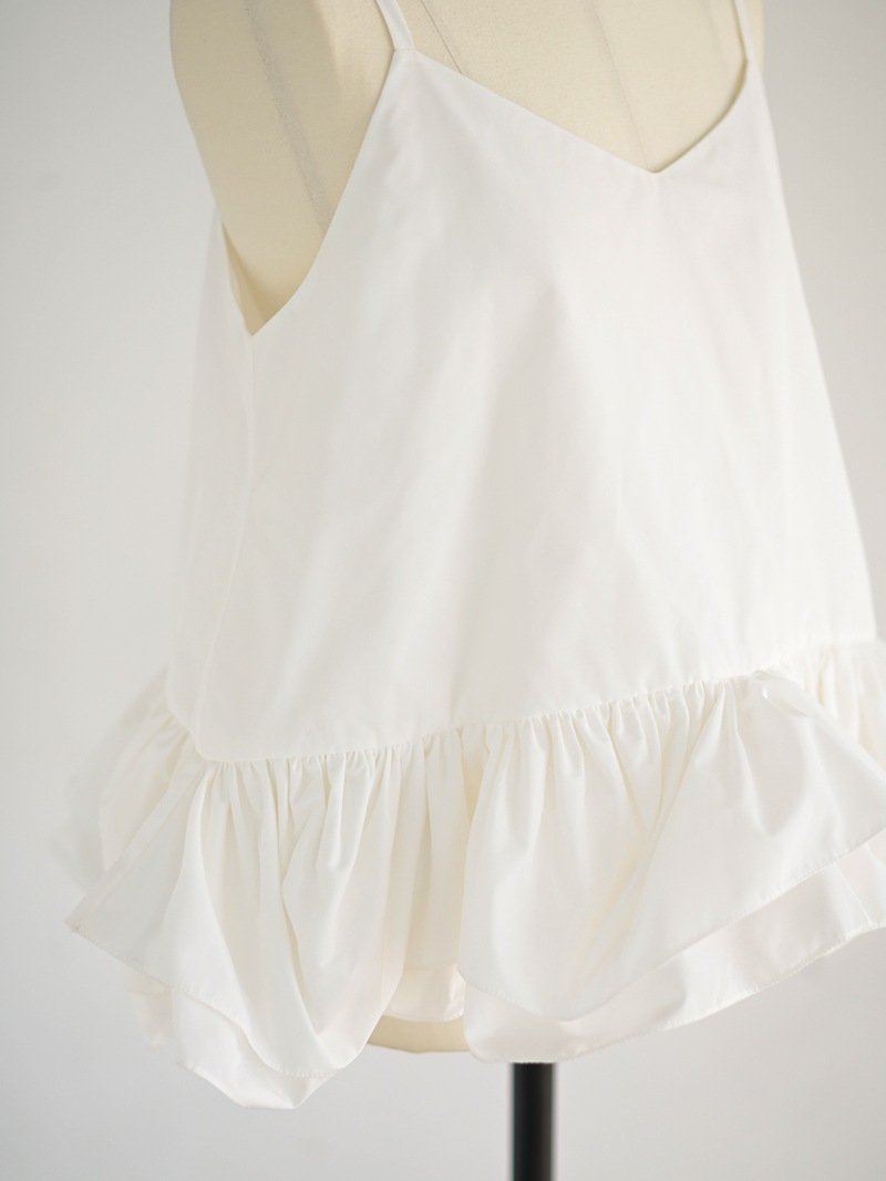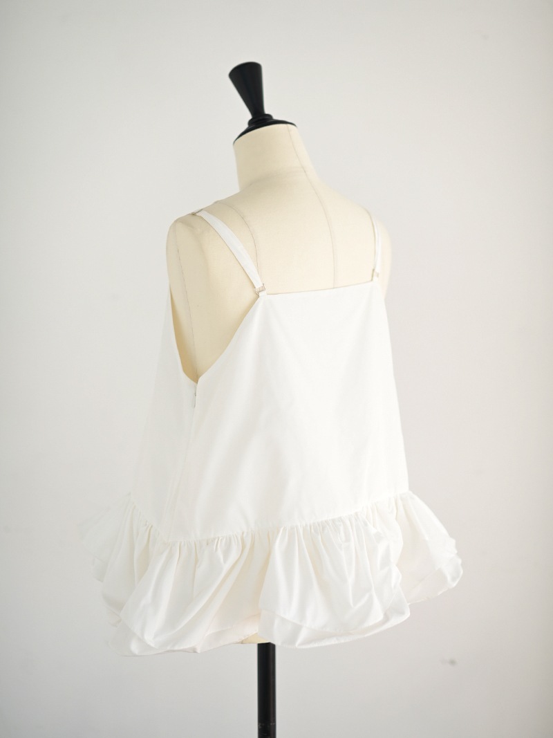 ハリのある薄手のタフタ素材で仕立てた、レイヤードキャミソール。裾にたっぷり施したフリルは、ハリのある生地を使用することで動きやボリュームなどお好みで調整可能。
