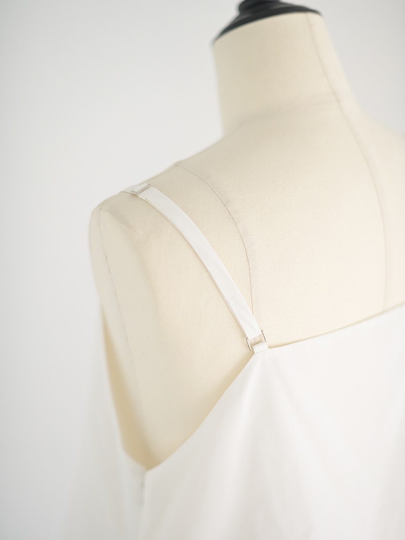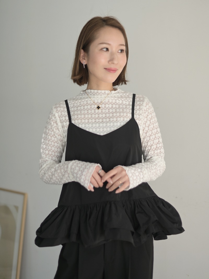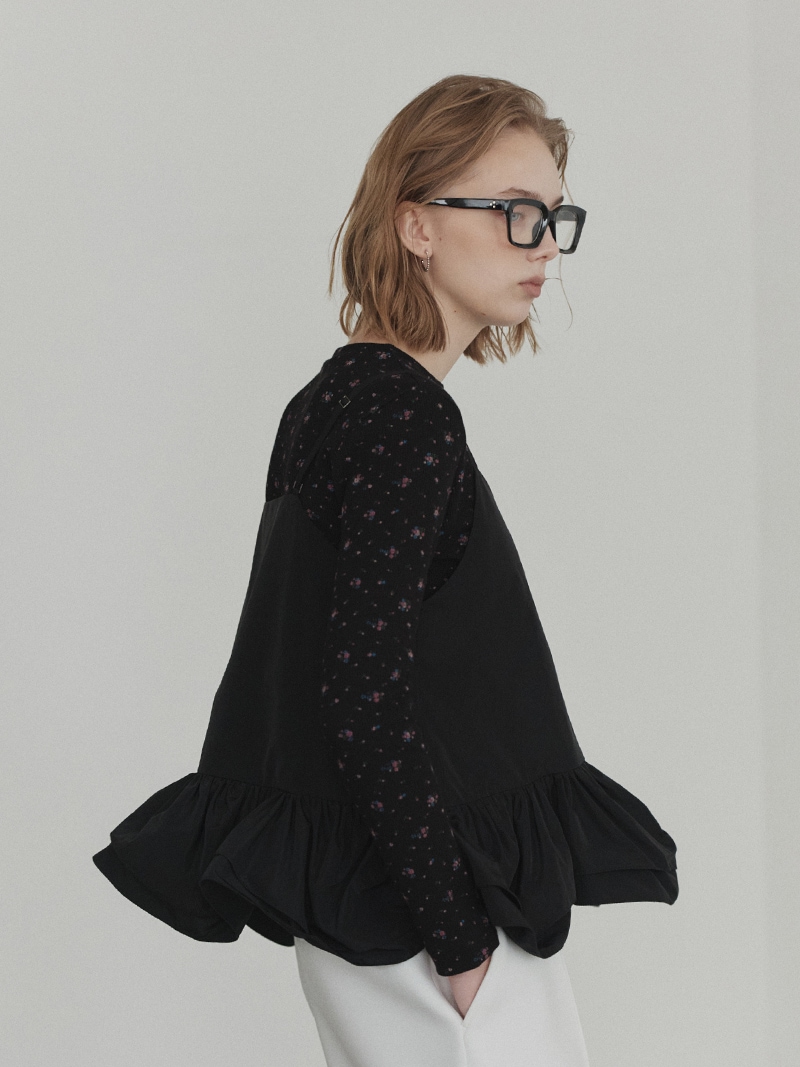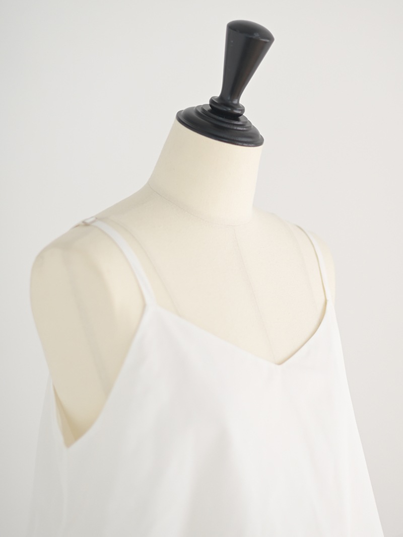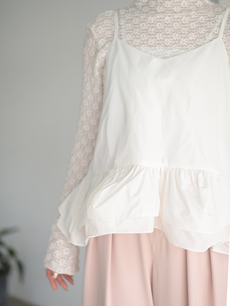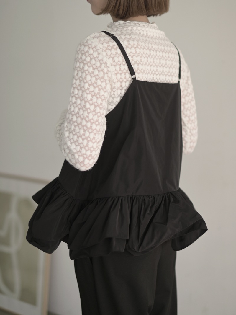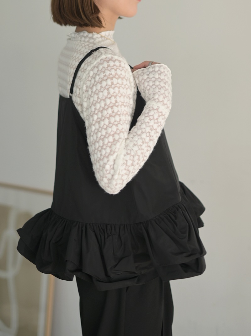ハリのある薄手のタフタ素材で仕立てた、レイヤードキャミソール。裾にたっぷり施したフリルは、ハリのある生地を使用することで動きやボリュームなどお好みで調整可能。