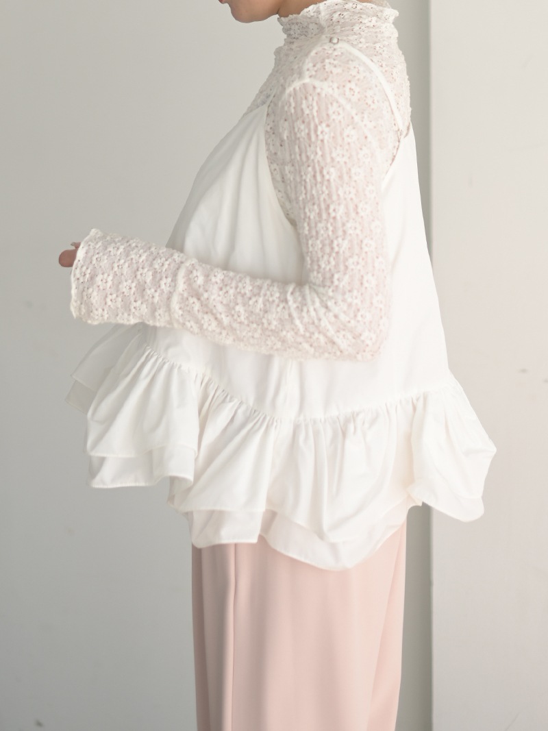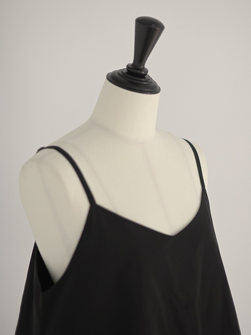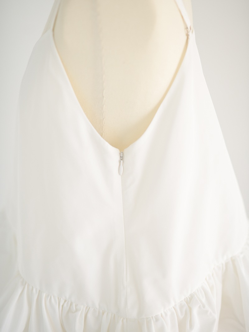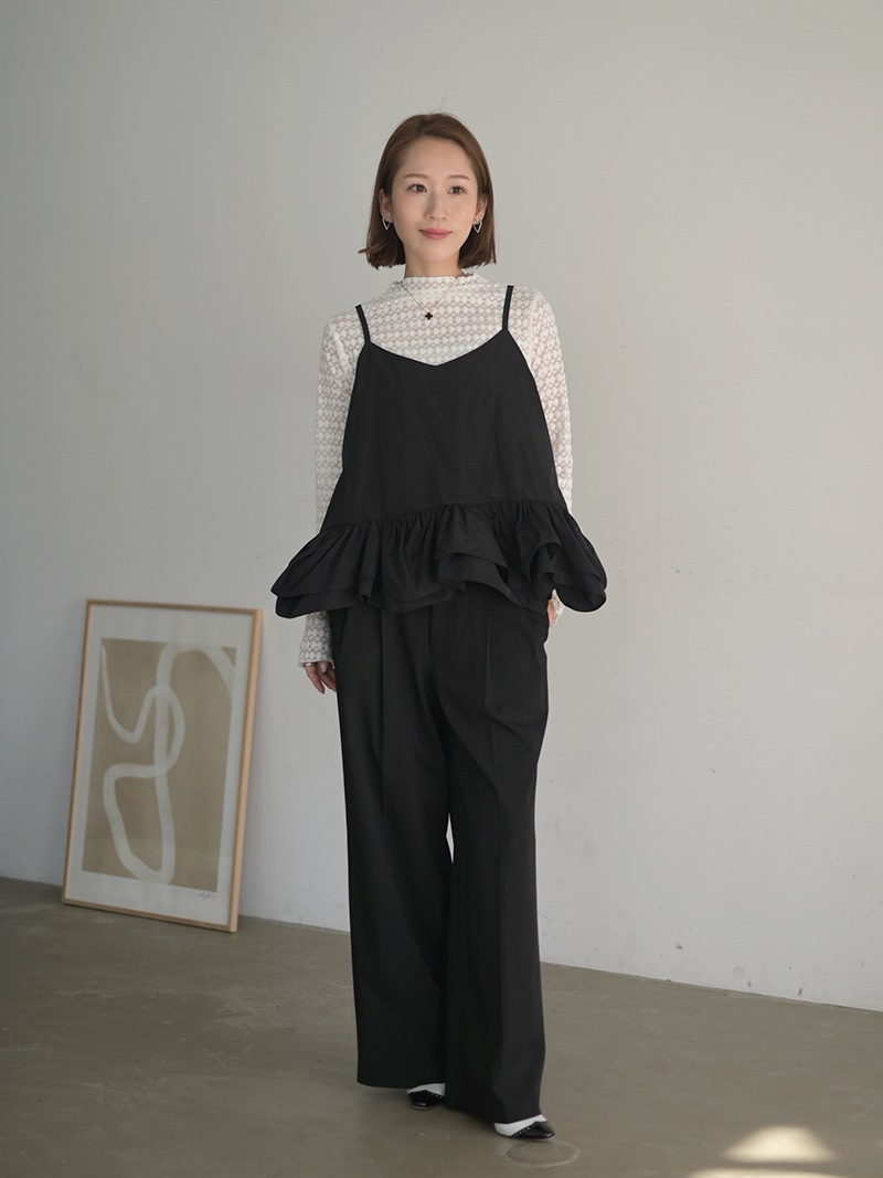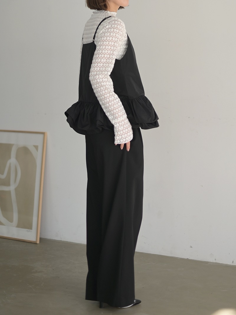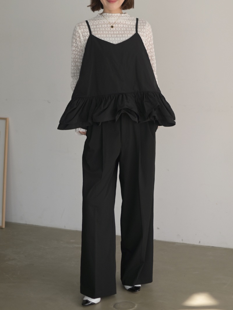 ハリのある薄手のタフタ素材で仕立てた、レイヤードキャミソール。裾にたっぷり施したフリルは、ハリのある生地を使用することで動きやボリュームなどお好みで調整可能。