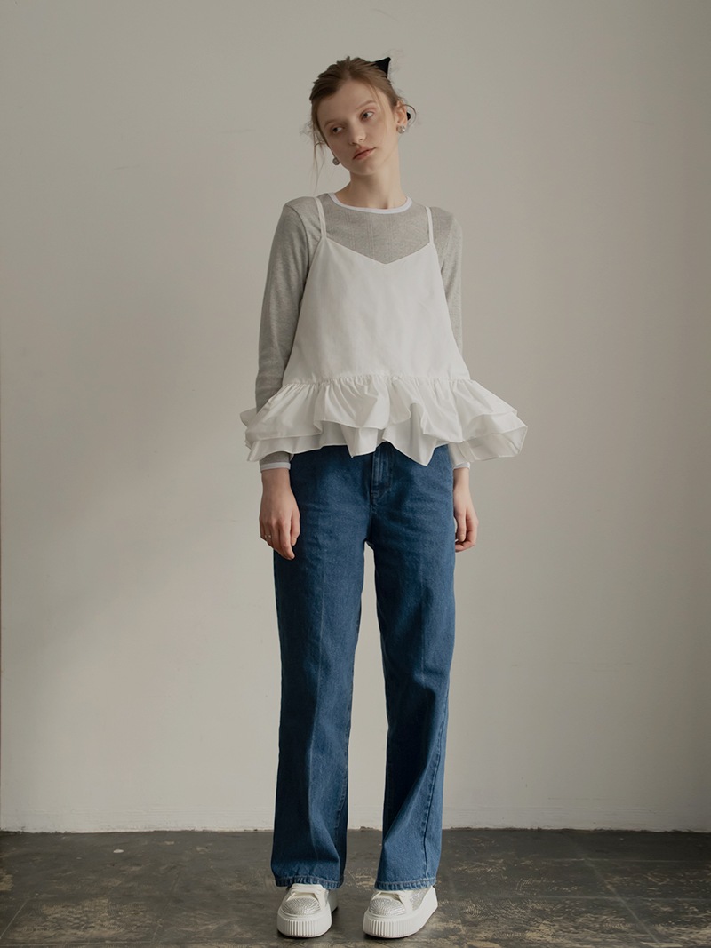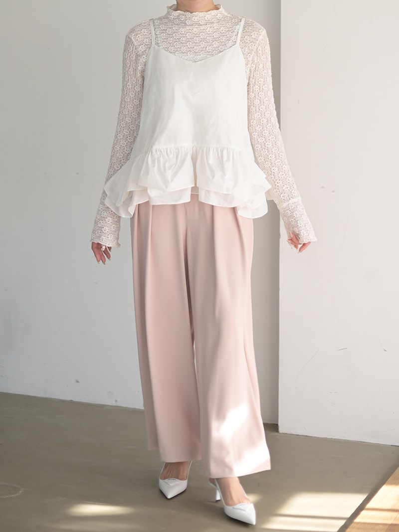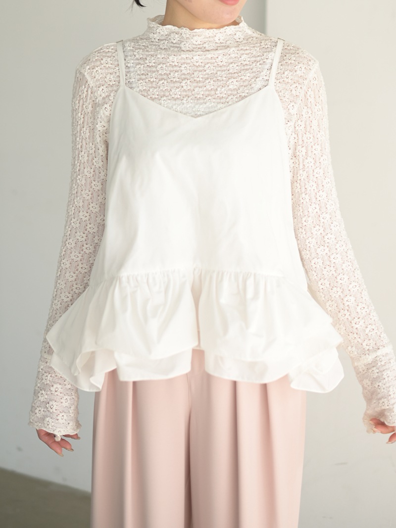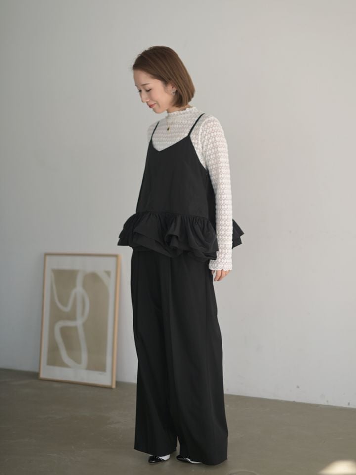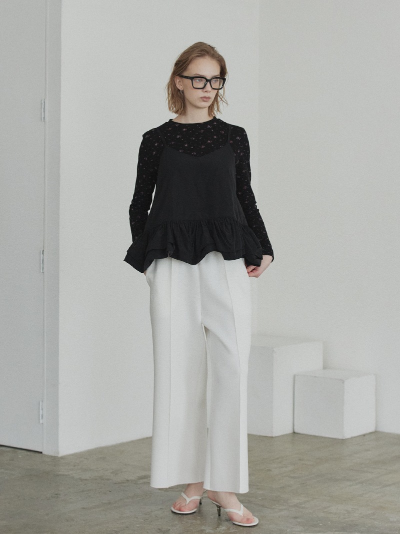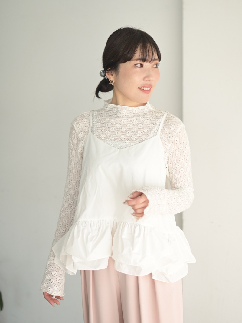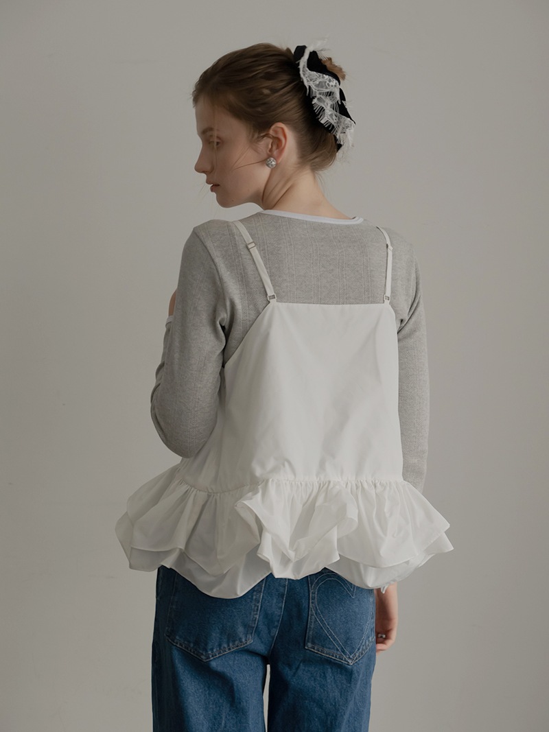 ハリのある薄手のタフタ素材で仕立てた、レイヤードキャミソール。裾にたっぷり施したフリルは、ハリのある生地を使用することで動きやボリュームなどお好みで調整可能。