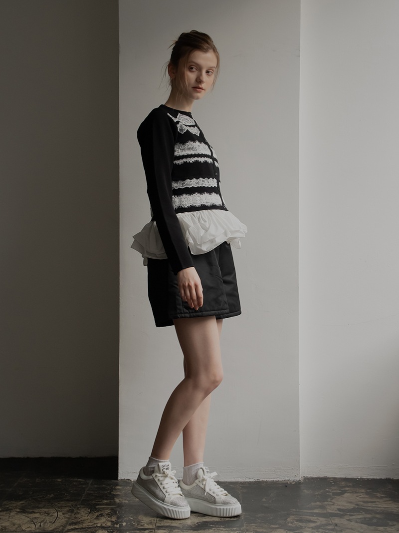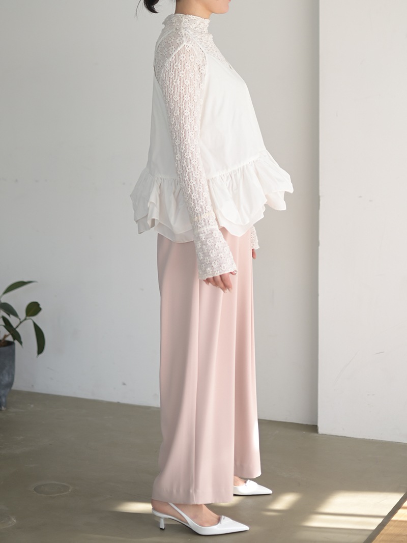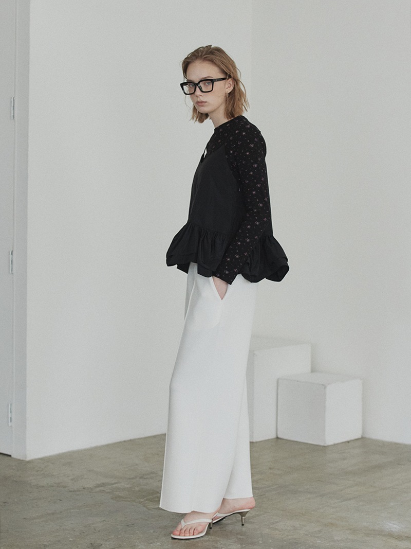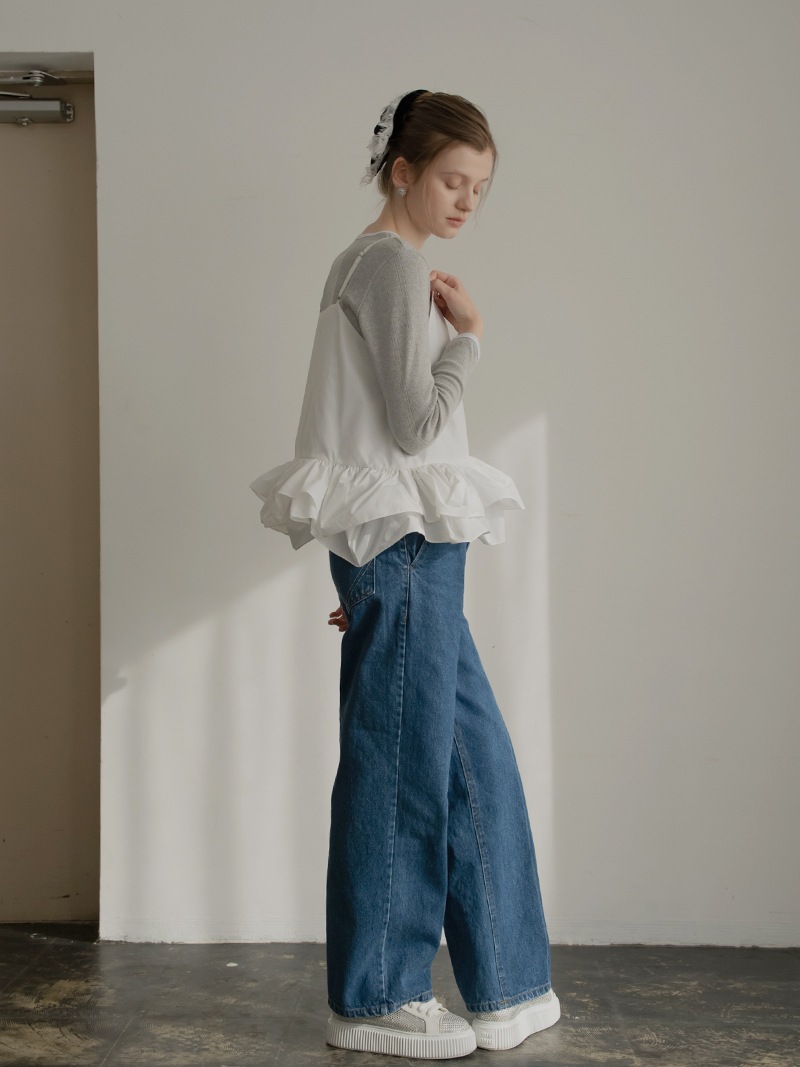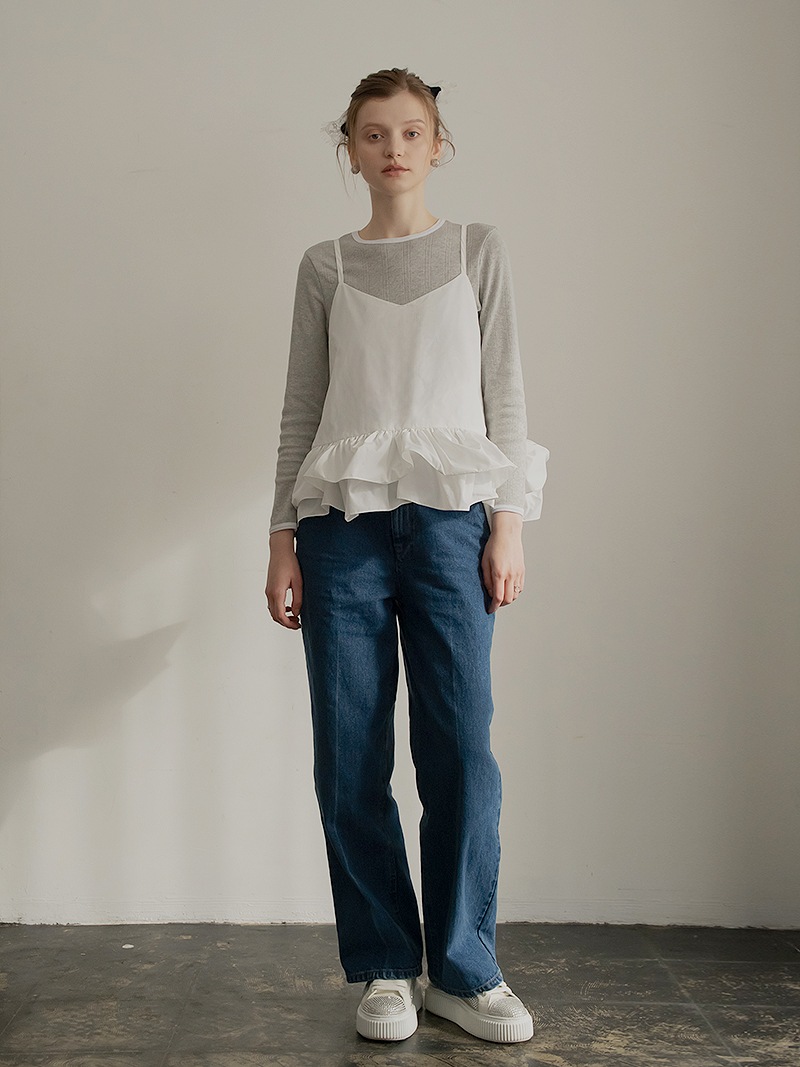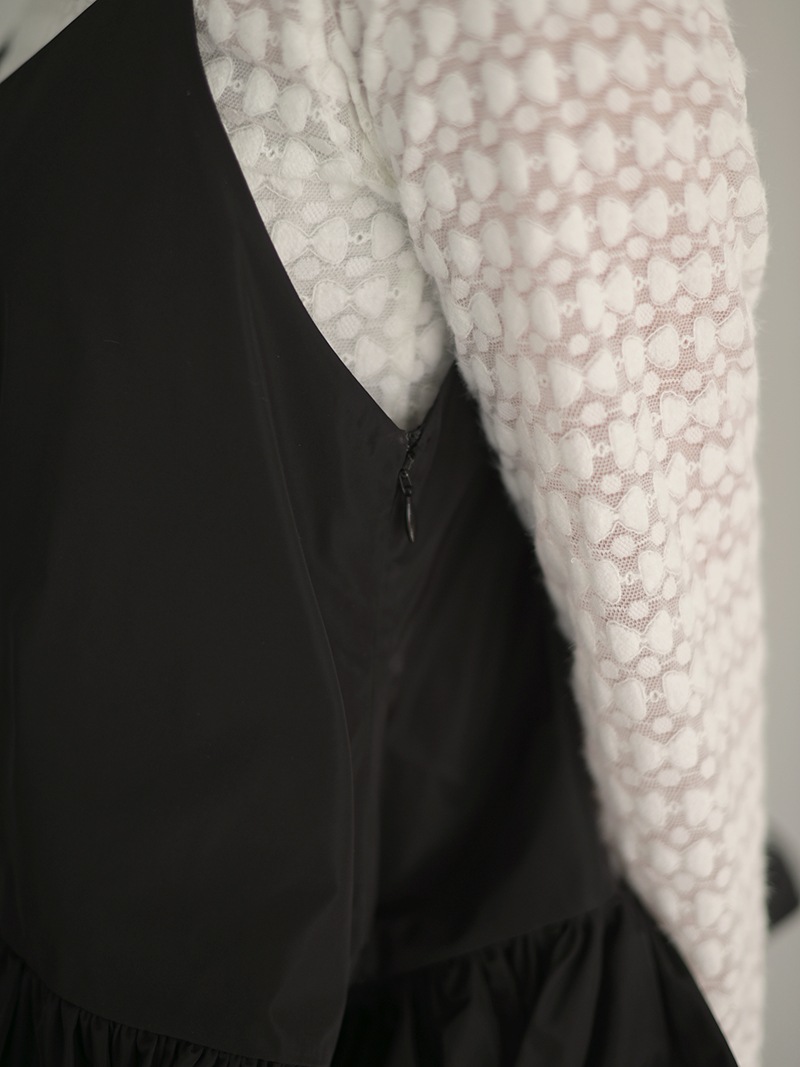 ハリのある薄手のタフタ素材で仕立てた、レイヤードキャミソール。裾にたっぷり施したフリルは、ハリのある生地を使用することで動きやボリュームなどお好みで調整可能。